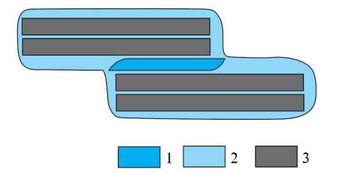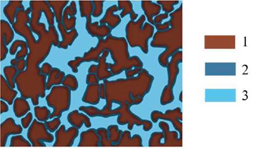 Рис. 2. Пленка адсорбированной воды в глинах: 1 – поверхность минерала, 2 – пленка адсорбированной воды, 3 – поровое пространство, заполненное свободной водой.