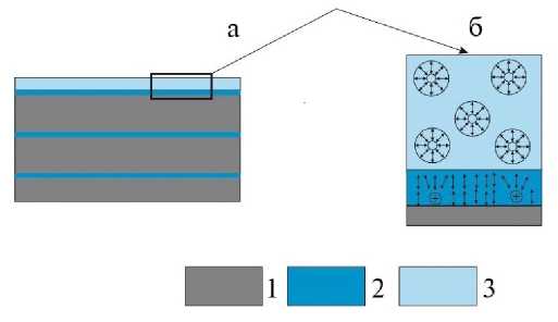 Рис. 3. Строение пленки адсорбированной воды на поверхности частиц глинистых минералов: 1 – поверхность минерала, 2 – структурно ориентированная адсорбированная вода, 3 – диффузная адсорбированная вода.