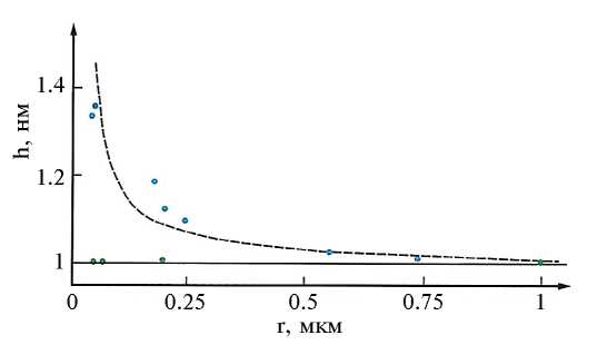 Первые данные по определению расклинивающего давления [3] были получены в ходе уникального эксперимента по измерению давления в тонкой гидратной пленке на контакте твердой поверхности с пузырьком воздуха (рис. 7). В эксперименте создавались условия, когда пузырьки воздуха различного радиуса R0, всплывая, приближались к твердой поверхности. Всплывший пузырек образовывал с твердой поверхностью контактную площадку радиусом r1 с толщиной граничной пленки на контакте, равной h. Путем измерения радиуса пузырька и толщины граничной пленки оценивалось граничное давление пленки по капиллярному давлению пузырька ΔPk = 2σw/R0, где σw – поверхностное натяжение воды, а ΔPk – капиллярное давление пузырька, R0 – радиус пузырька.