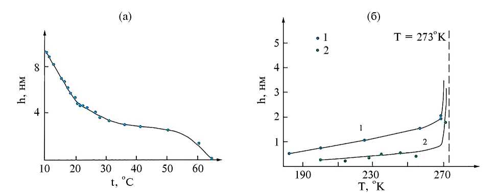 Структурированная пленка адсорбированной воды проявляет сильную температурную зависимость как в области положительных, так и отрицательных температур. Прямые измерения толщины такой пленки при различных температурах свидетельствуют, что она уменьшается при повышении температуры. Структура пленки при достижении 65°C разрушается под влиянием теплового движения молекул, и она полностью исчезает (рис. 5а). Фазовый переход адсорбированной воды в лед происходит при более низких (отрицательных) температурах по сравнению со свободной водой, с уменьшением толщины пленки температура ее замерзания снижается (рис. 5б).