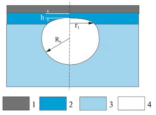 Рис. 7. Пузырьковый метод получения изотермы расклинивающего давления гидратной пленки связанной воды: 1 – твердое тело, 2 – адсорбированная вода, 3 – свободная вода, 4 – пузырек воздуха.