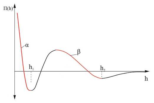 Зависимость суммарного действия расклинивающего давления граничной гидратной нанопленки в зазоре между твердыми телами от толщины пленки h получила название изотермы расклинивающего давления [5]. Качественная картина такой зависимости показана на рис. 8. На диаграмме выделяются две ветви величины расклинивающего давления П (h), соответствующие устойчивости α- и β-пленок.