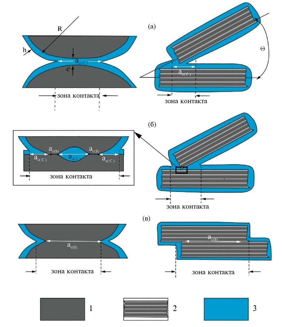 Рис. 9. Типы контактов: коагуляционные (а), смешанные (б) и фазовые (в). 1, 2 – частицы, 3 – пленка адсорбированной воды. Участки контактов: ас(С) – коагуляционных, ас(S) – фазовых.