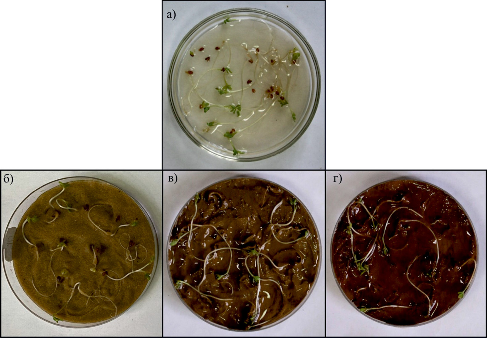 Рис. 2. Общий вид результата биотестирования на дистиллированной воде (а), песке (б), супеси (в) и суглинке (г) в чашках Петри с использованием культуры кресс-салата (Lepidium sativum L.).