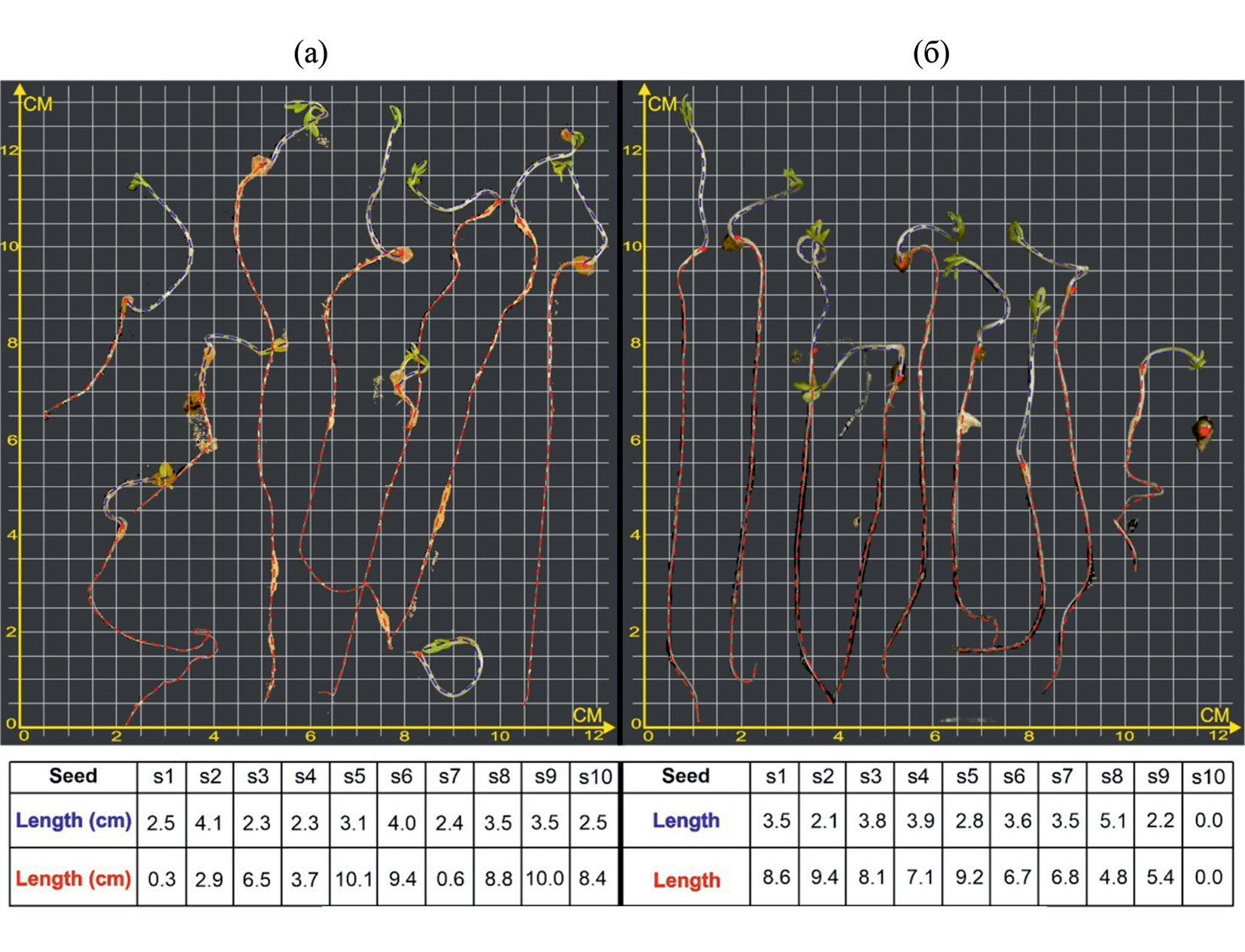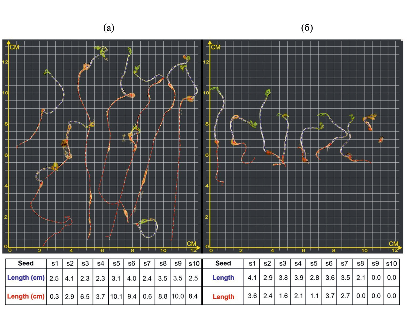 Рис. 9. Полуавтоматическая обработка результатов фитотестирования с использованием программного комплекса на основе машинного обучения (а – контрольная проба, б – проба с комбинированным модельным загрязнением).