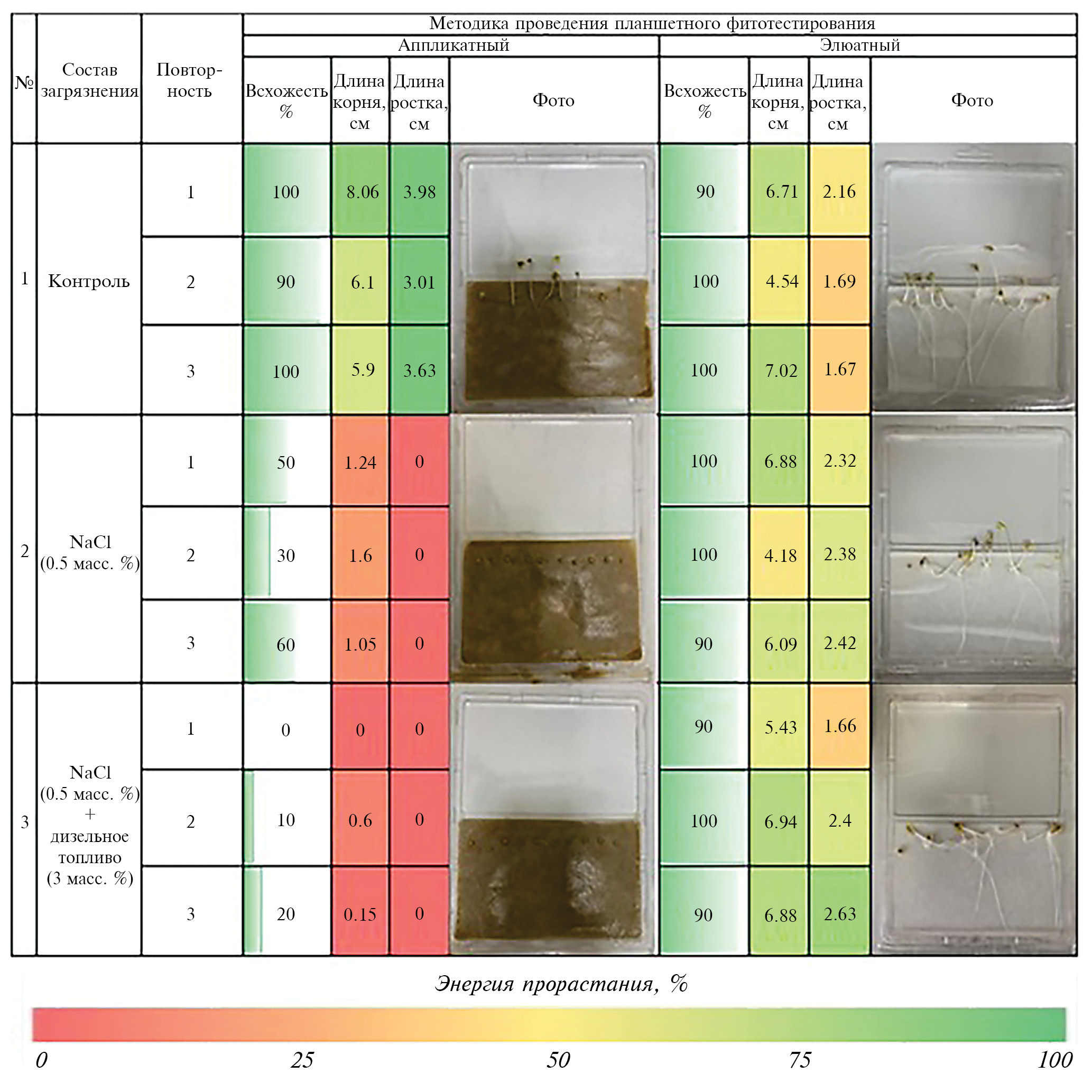 Проведенные экспериментальные исследования позволили уточнить ряд методических положений общих нормативных документов и рекомендовать усовершенствованные методики для широкого применения в лабораторной практике грунтоведения. Наиболее приемлемым на сегодняшний день видится использование варианта биотестирования с применением высших растений (фитотестирования), с использованием культур, включенных в соответствующие нормативы [8, 9, 42, 44]. Применение регламентированных культур позволяет получить сопоставимые для сравнительного анализа результаты, при одновременном условии высокой чувствительности этих культур к широкому спектру загрязняющих веществ. При этом следует отметить, что из спектра рекомендованных нормативами культур по чувствительности, а также при соблюдении методических аспектов использования семян, фиксации и обработки данных фитотестирования наилучшие результаты были получены авторским коллективом в отношении горчицы белой (Sinapis alba L.) и кресс-салата (Lepidium sativum L.).