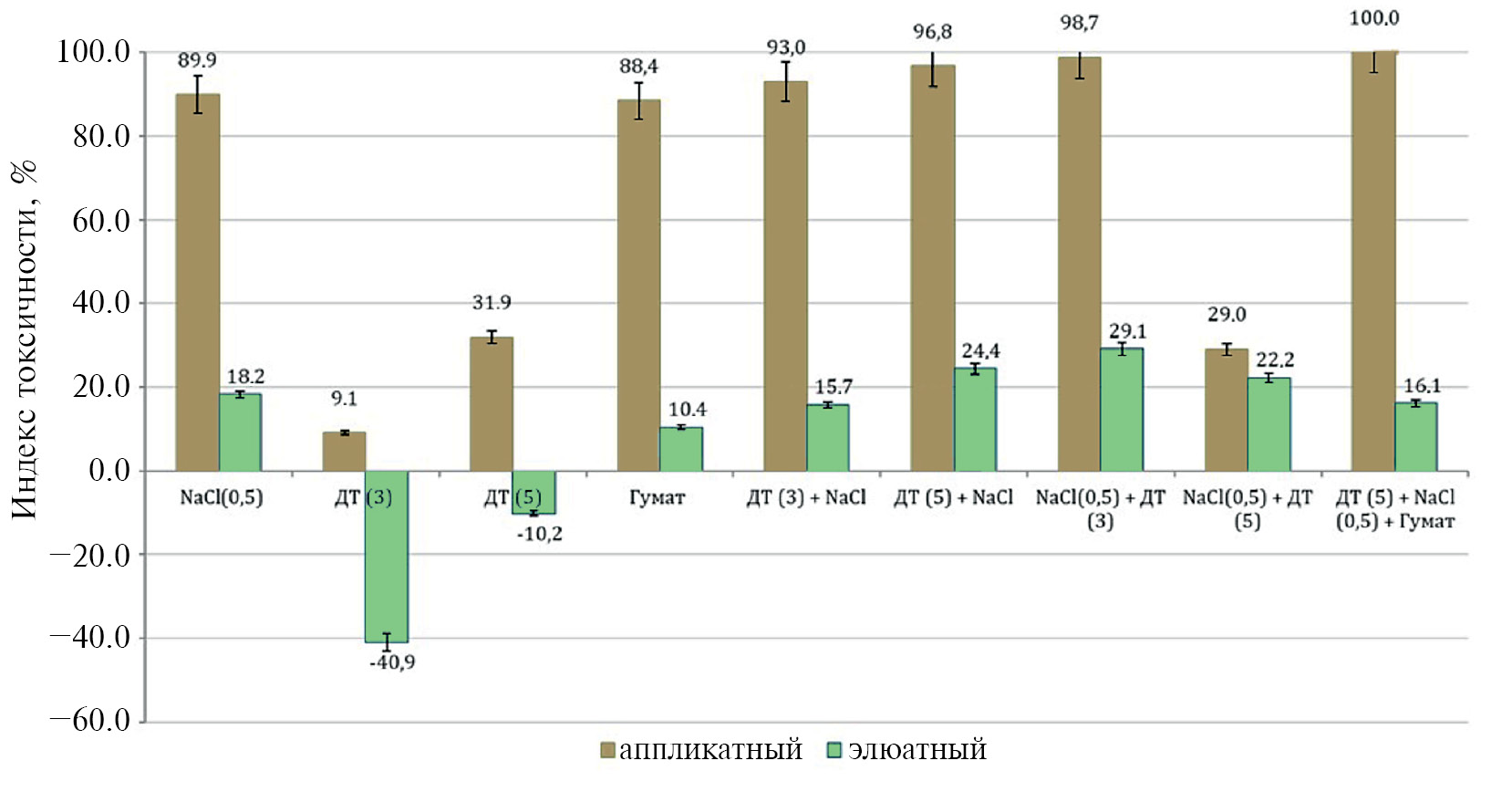 Результаты, полученные с применением апликатного и элюатного вариантов тестирования (см. рис. 9), ярко продемонстрировали существенные различия оценок, когда при выбранных заведомо токсичных концентрациях загрязнителя по элюатному варианту эксперимента не удалось обнаружить наличия токсического эффекта на двудольную культуру − Sinapis alba (горчицу белую).