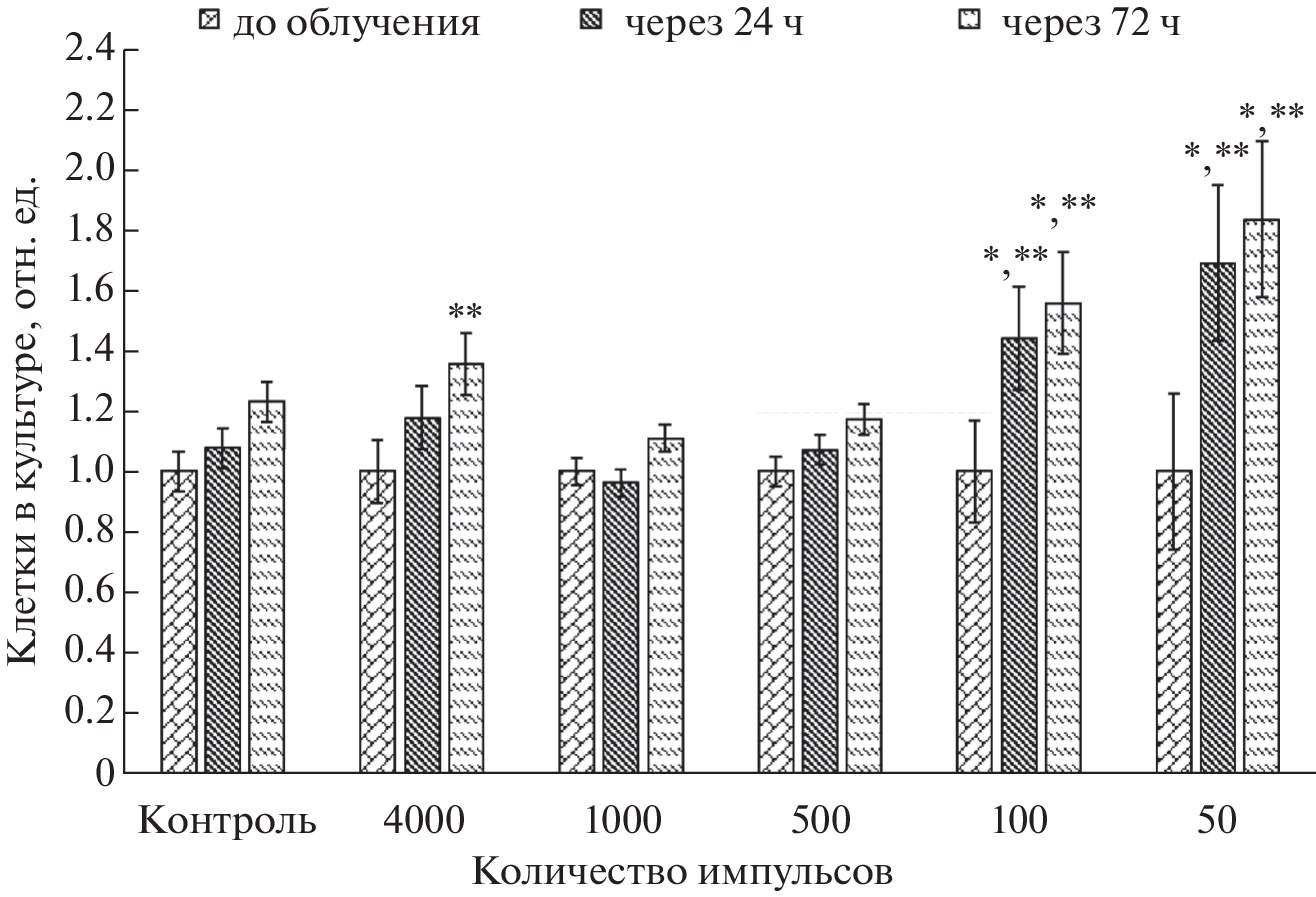 The effect of nanosecond repetitively pulsed microwave radiation (RPM, 50–4000 pulses, pulse repetition rate of 13 Hz, peak power flux density of 140 W/cm2, carrier frequency of 10 GHz) on the stimulation of me-senchymal stem cells (MSC) proliferation was studied. The effect of exposure was assessed by the change in the number of cells in the culture after a single irradiation with a different number of pulses. The most pronounced effect exerted by the impact with 100 and 50 pulses, and the effect is realized with a maximum speed after 24 hours.