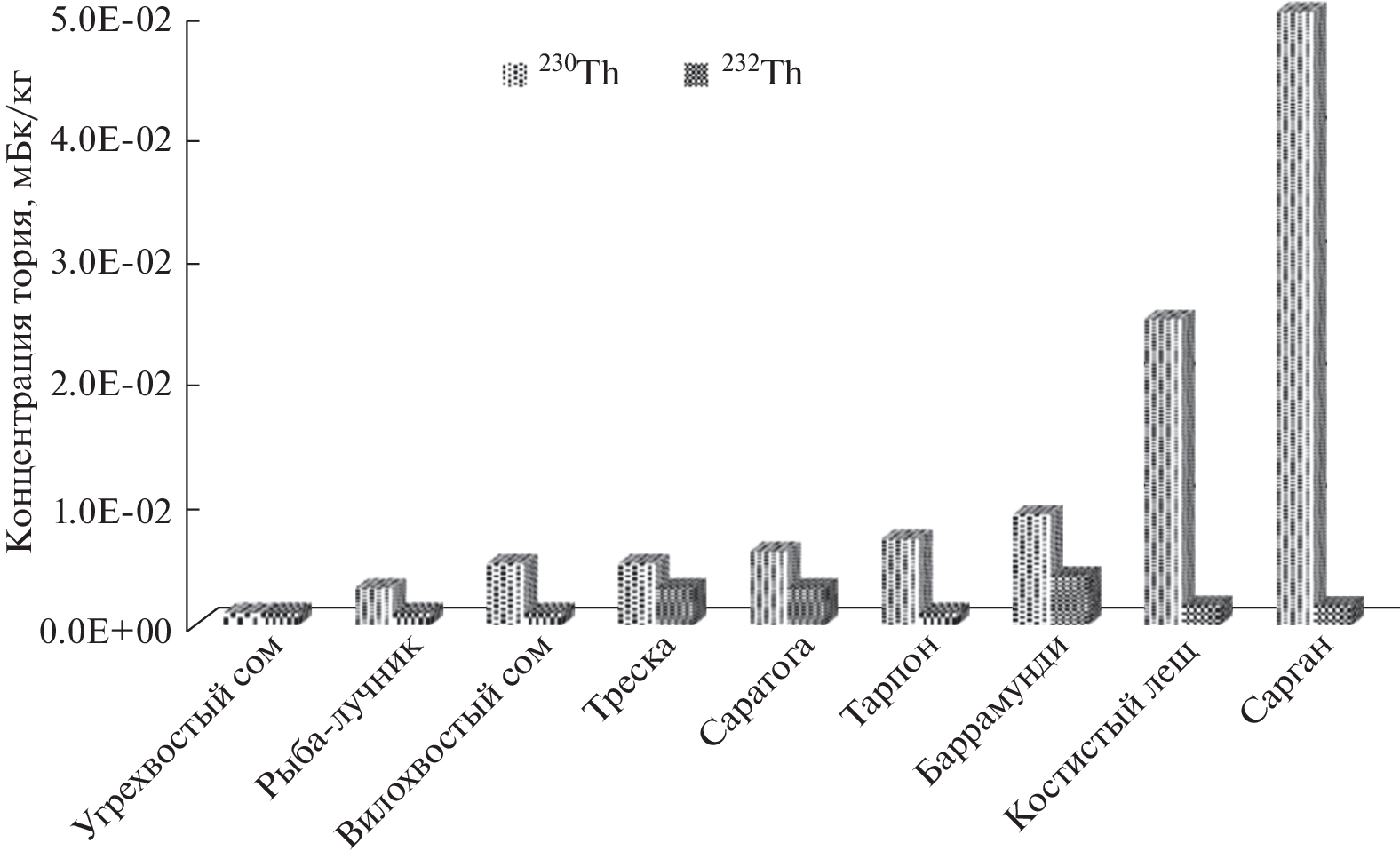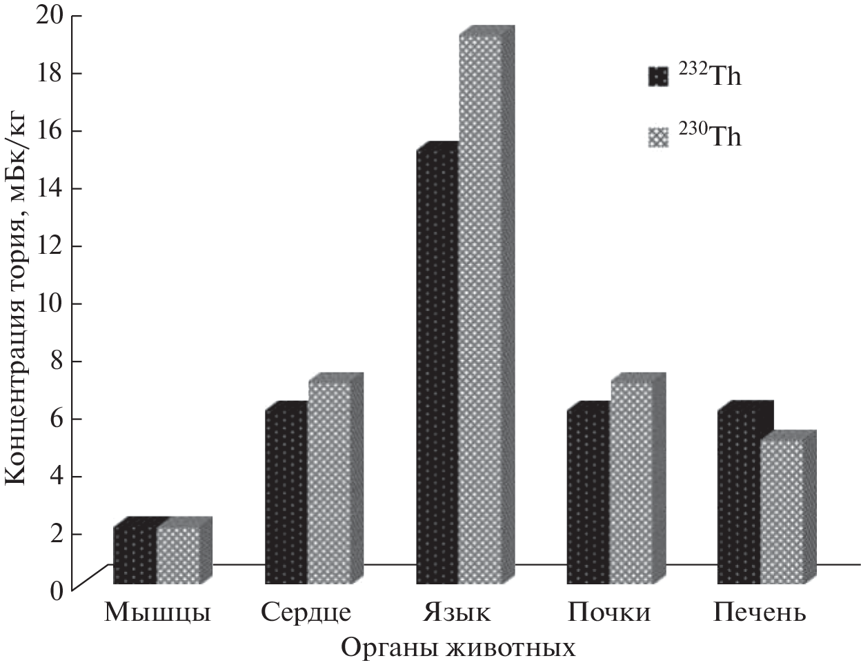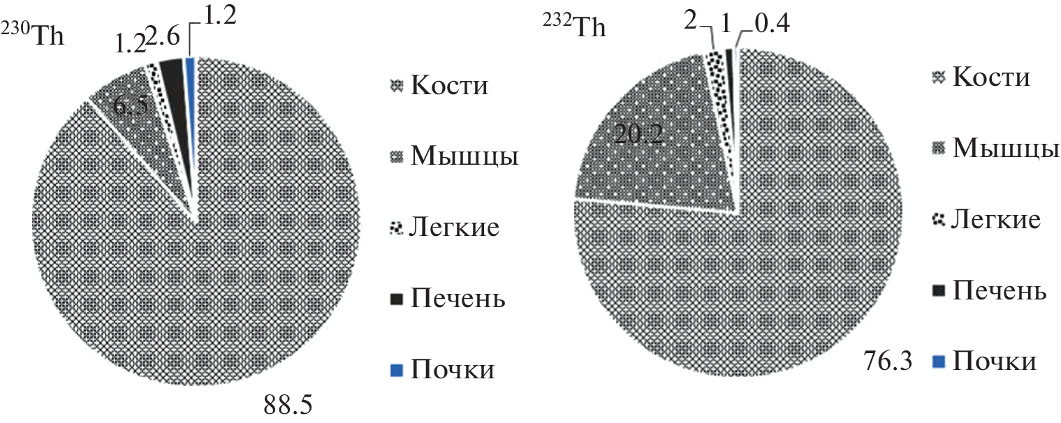 An overview of data on thorium concentrations in terrestrial animals, as well as freshwater organisms is presented. Concentrations of 232Th in both animals and fish vary widely, reflecting environmental thorium concentrations. Thorium concentrations in the regions with a normal thorium background in animal tissues were in a range from 0.9 × 10–4 to 2.1 × 10–2 Bq/kg, and from 3.1 × 10–2 to 1.4 × 10–1 Bq/ kg in the areas with high thorium concentrations in the soil. Significantly higher values were observed in wild animals’ tissues. The highest 232Th concentrations were found to be in the skeleton, followed by lungs, kidneys, liver and finally muscles. It has been shown that thorium accumulation is higher in species occupying a higher position in the trophic chains. In areas with normal thorium background, the concentration of 232Th in fish can reach 1.0 × 10–1 Bq/kg (fresh mass), and in areas of high thorium background this value can be up to 100 times higher. The obtained results show the importance of study on the thorium transfer along the food chains and the need to consider observed regularities when assessing the consequences of radioactive contamination of the environment.