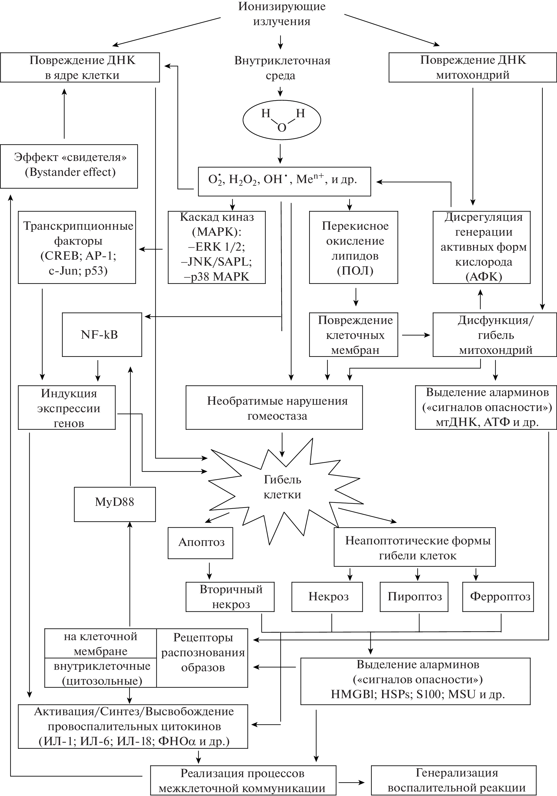 Ionizing radiation induces a complex of genetic, biochemical, structural and functional changes in the body. The inflammatory response development is acknowledged as one of the manifestations of systemic bodily response to ionizing radiation exposure, and this response, through the activation of immunity, acts both as protector and leads to the development of undesirable early, delayed and off-target effects. Its underlying molecular and cellular mechanisms are defined by DNA damage, free radical metabolic changes (primarily reactive oxygen and nitrogen species), oxidative stress development, inflammasome activation, “danger signals” release and pro-inflammatory cytokines production. The role of non-apoptotic cell death forms (ferroptosis and pyroptosis) is described in the genesis of post-radiation inflammatory response and subsequent tissue, organ, and system damages. The post-radiation inflammatory reaction’s ability to take form of a time-stable self-sustaining process – that increases the radiation-induced damage severity – due to the presence of a positive feedback between different components of its pathogenesis is noted.