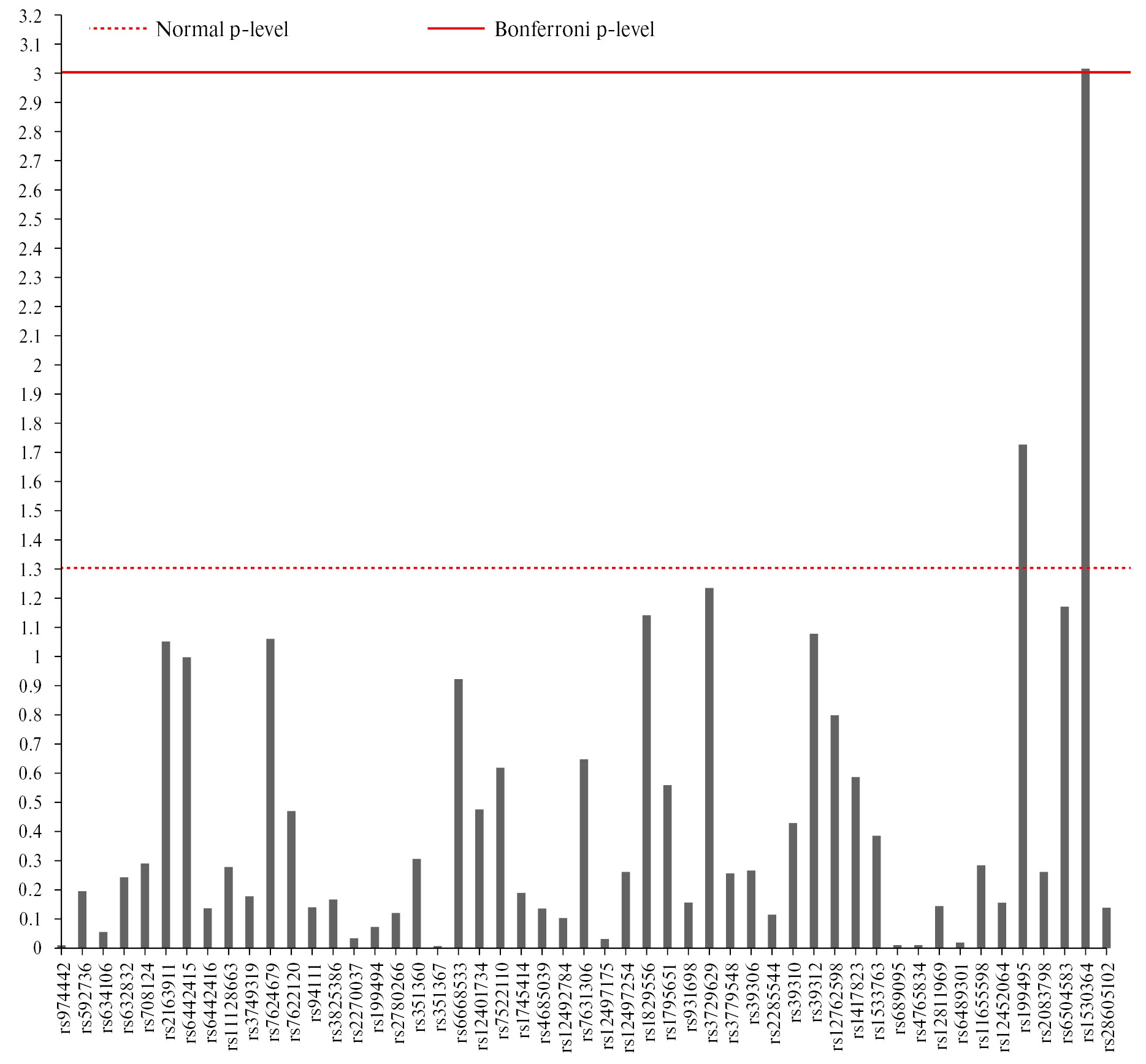 При анализе данных исключены ОНП любого генотипа при n < 5, поскольку в условиях малочисленной выборки это увеличивает вероятность ошибки первого рода. Из дальнейшего анализа исключили также ОНП, не соответствующие равновесию Харди–Вайнберга. В результате из 116 ОНП в окончательный статистический анализ был включен 51 ОНП.