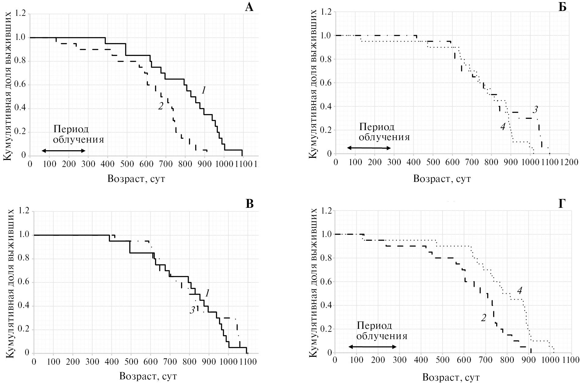 Рис. 1. Кумулятивная выживаемость мышей ICR (CD-1) по Каплану–Майеру облученных фракционно в суммарной дозе 1.65 Гр и необлученных: А — облученные (2) и необлученные (1), содержавшиеся на водопроводной воде; Б — облученные (4) и необлученные (3), содержавшиеся на дистиллированной воде; В — необлученные, содержавшиеся на водопроводной (1) и дистиллированной (3) воде; Г — облученные, содержавшиеся на водопроводной (2) и дистиллированной (4) воде.