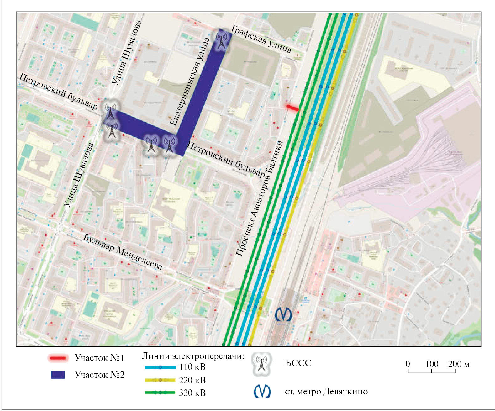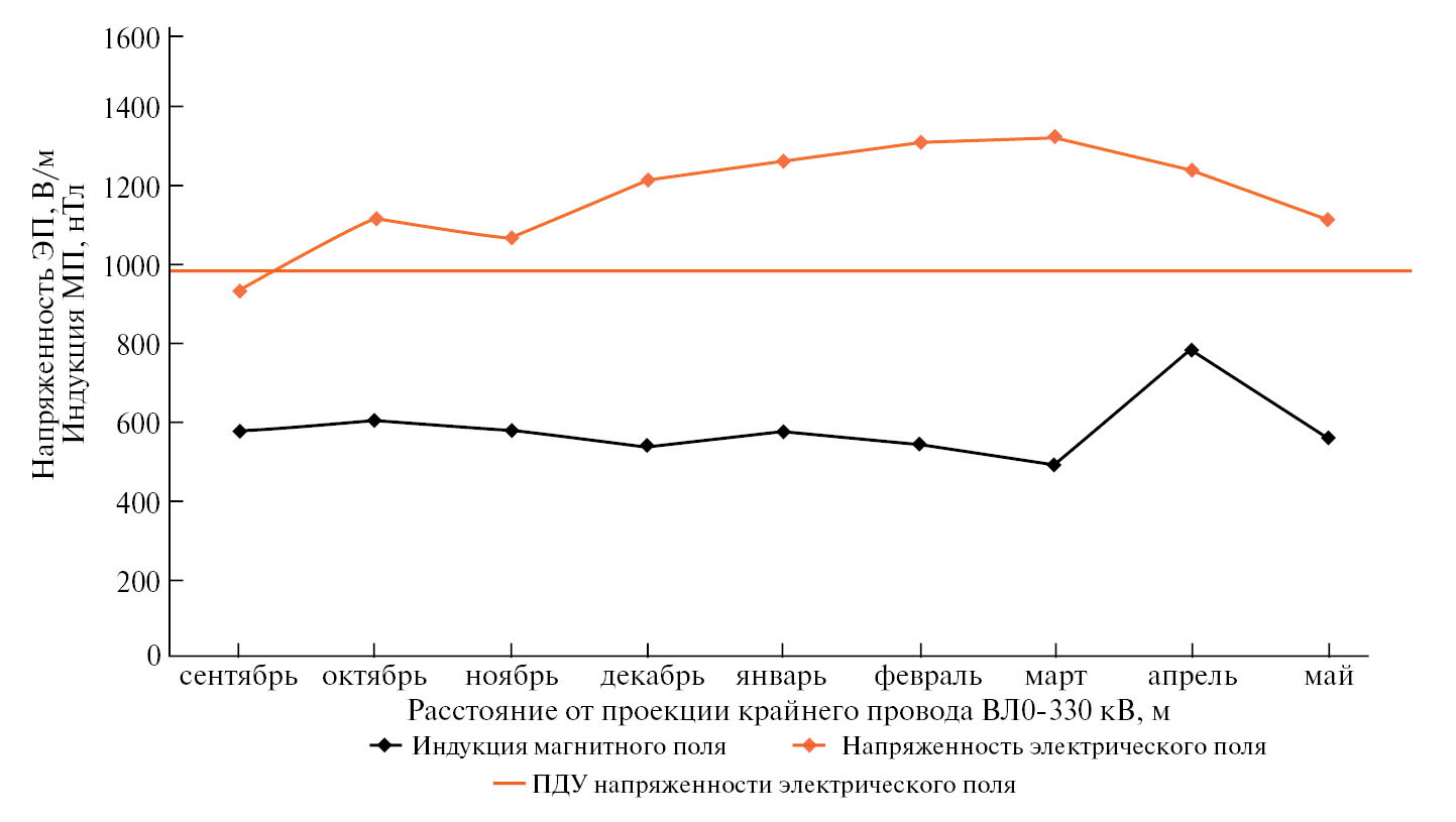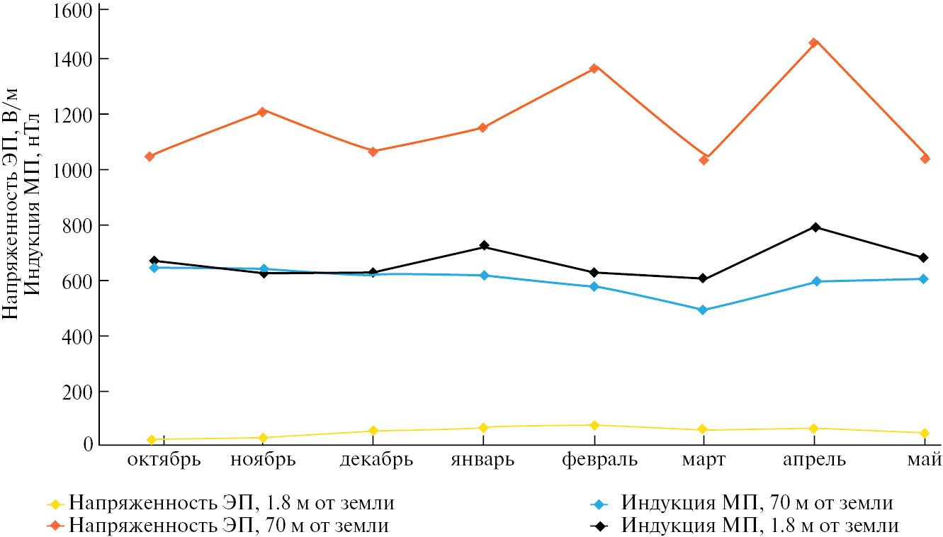 The tool research of electromagnetic fields of industrial frequency and radio-frequency range in by Murino of the Leningrad Region is executed. Steady excesses of admissible level of tension on borders of a sanitary rupture of the high-voltage line of 330 kV are revealed. Excesses of admissible levels of magnetic induction and in the radio-frequency range – energy stream density are not revealed. It is established that the difference of values of electric field strength in 1.8 m from a surface and at the height of 72 m reaches 1–2 orders that can be explained only with the grounding Earth’s surface role. Considerable divergences of the settlement and measured values of tension and magnetic induction are revealed that means insufficiently correct account when calculating electrophysical properties of air. The detailed cards of density of a stream of energy showing a difficult, but steady picture of distribution of values are created. Some elements of territorial structure of electromagnetic fields of radio-frequency range – fragments of rings around base stations of cellular communication, and the auras dated for certain houses are revealed.