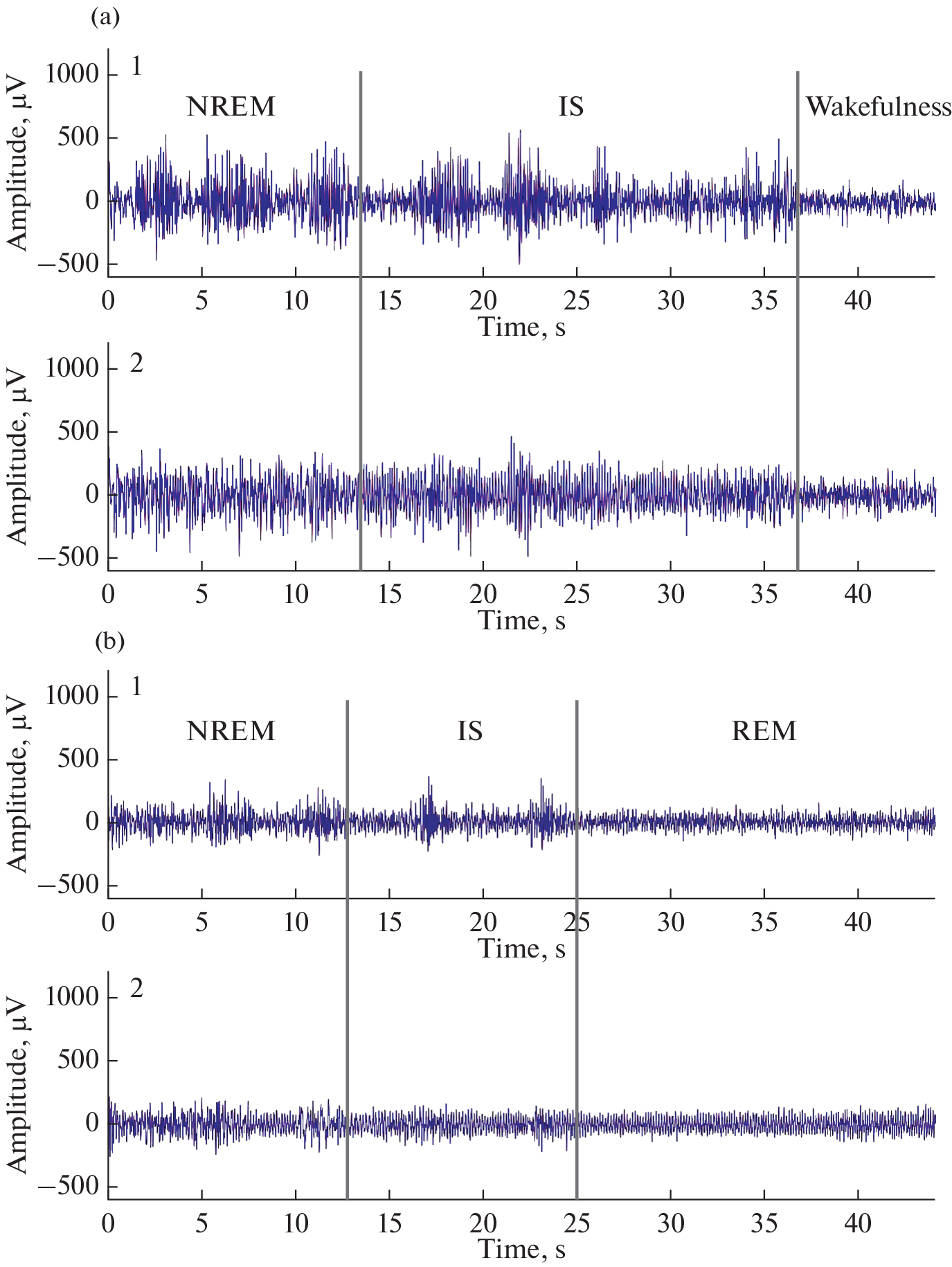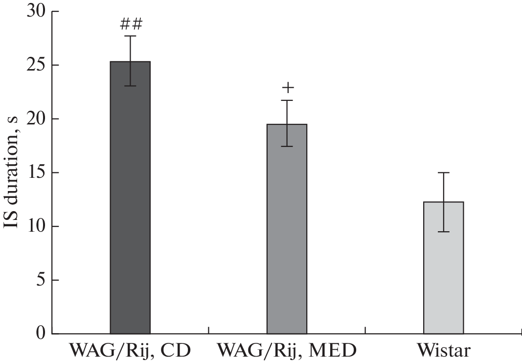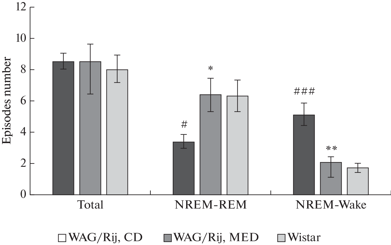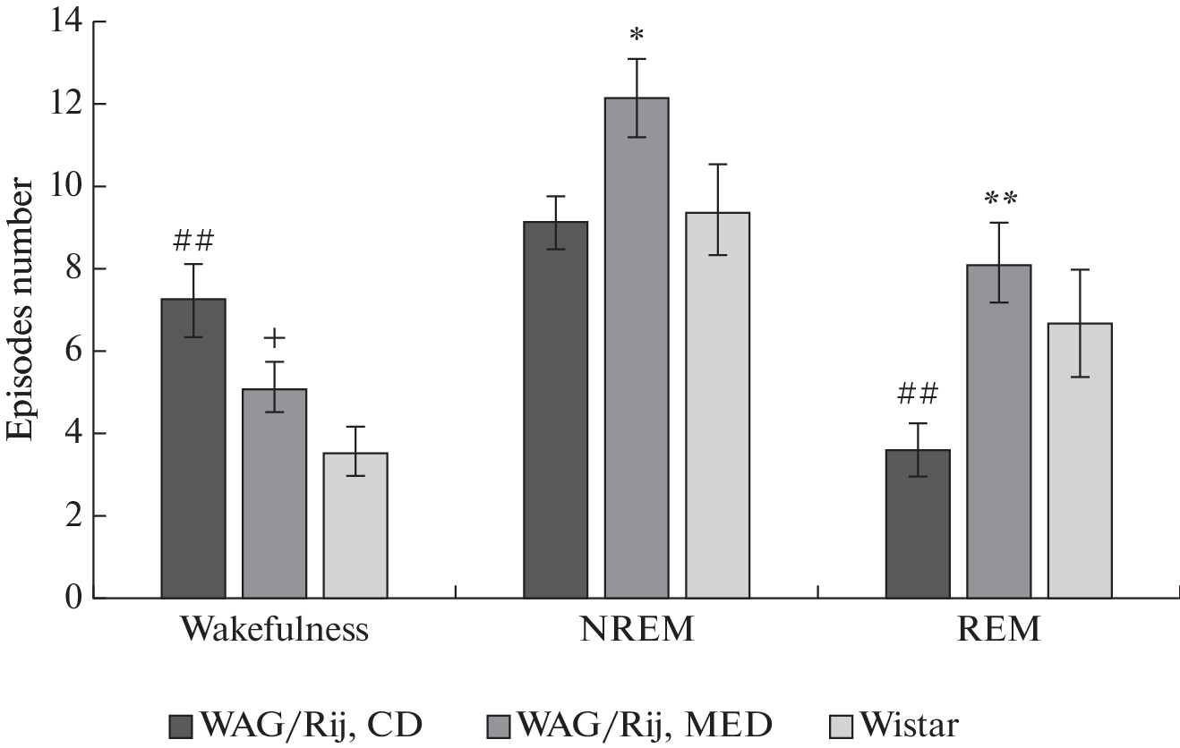 Ранее было показано, что перинатальная метилобогащенная диета (МОД) матери уменьшает число пик-волновых разрядов (ПВР) и поведенческие симптомы депрессии у взрослого потомства крыс линии WAG/Rij. Эпилепсия и депрессия обычно сопровождаются нарушениями цикла сон–бодрствование. ПВР и сонные веретена являются различными проявлениями таламокортикальной активности. Предполагается, что патологические изменения в таламокортикальной системе, которые приводят к ПВР, изменяют и сонные веретена. Возможно, что МОД матери оказывает положительное влияние не только на ПВР, но и на сонные веретена. Цель данной работы – выяснить, влияет ли МОД матери на цикл сон–бодрствование и изменяет ли характеристики сонных веретен у взрослого потомства крыс линии WAG/Rij. Показано, что у потомства крыс линии WAG/Rij, рожденных матерями, потреблявшими в перинатальном периоде МОД, по сравнению с потомством, матери которого потребляли контрольную диету (КД), значимо увеличивается относительная длительность быстрого сна. У потомства крыс линии WAG/Rij, матери которых потребляли МОД, относительная длительность быстрого сна и число его эпизодов становятся неотличимыми от аналогичных показателей у неэпилептических крыс Wistar. МОД матери увеличивает также число переходов от медленноволнового сна к быстрому сну. Имеется значимая отрицательная корреляция между числом ПВР и длительностью быстрого сна. МОД матери по сравнению с КД уменьшала амплитуду и спектральную плотность мощности сонных веретен. Они становились значительно ближе к амплитуде и спектральной плотности мощности сонных веретен у крыс Wistar. Таким образом, МОД матери нормализует цикл сон–бодрствование и характеристики сонных веретен у взрослого потомства крыс линии WAG/Rij. Мы предполагаем, что этот позитивный эффект связан с уменьшением симптомов абсанc-эпилепсии и коморбидной депрессии, а также с коррекцией активности таламокортикальной системы.