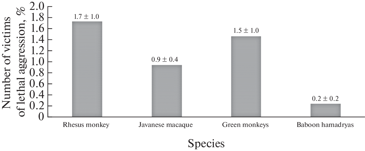 Establishing the characteristics of monkey lethal aggression, assessing the age and sex of aggressors and victims, and the nature of the aggressors' actions seems necessary to identify the evolutionary roots of cases of human lethal aggression. In addition, the study of the features of lethal aggression can be considered as a condition for the development of measures aimed at preventing its manifestations in captive monkeys. The aim of the study is to study the species-specific features of lethal aggression in captive macaques, baboons and guenons. An analysis was made of cases of intra-group lethal aggression that occurred over a 10-year period in Rhesus macaques (Macaca mulatta), Crab-eathing macaques (Macaca fascicularis), Pig-tail macaques (Macaca nemestrina), Green monkeys (Chlorocebus aethiops), Hamadryas baboons (Papio hamadryas), Anubis baboons (Papio anubis) kept by social groups. It has been established that cases of lethal aggression are observed in all 6 studied species of monkeys. It was shown that in groups consisting of adult males, the highest frequency of cases of lethal aggression was noted in Rhesus macaques, and the lowest in Hamadryas baboons. Species-specific differences were found in the nature of lethal aggression in monkey family groups consisting of males, females, infants, and adolescents. It has been established that in Hamadryas baboons, Anubis baboons and Pig-tail macaques, that is, in species with pronounced sexual dimorphism in body size and social status, the main form of lethal aggression in family groups is infanticide committed by a single sexually mature male. In Rhesus monkeys, Crab-eathing macaques and Green monkeys, that is, those species that are characterized by relatively mild sexual dimorphism in body size and social status, the predominant form of lethal aggression in family groups is the collective actions of females aimed at young and adult members of the group.