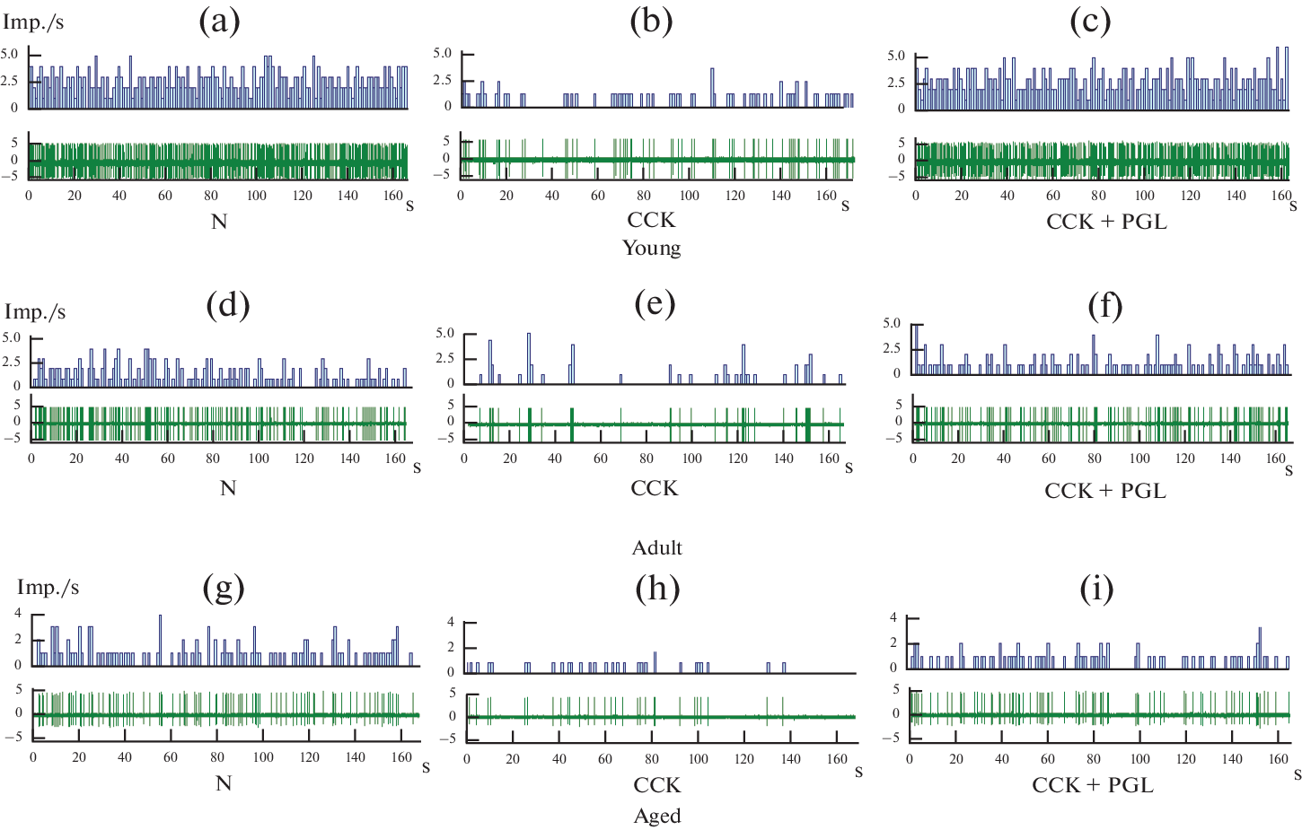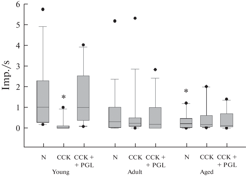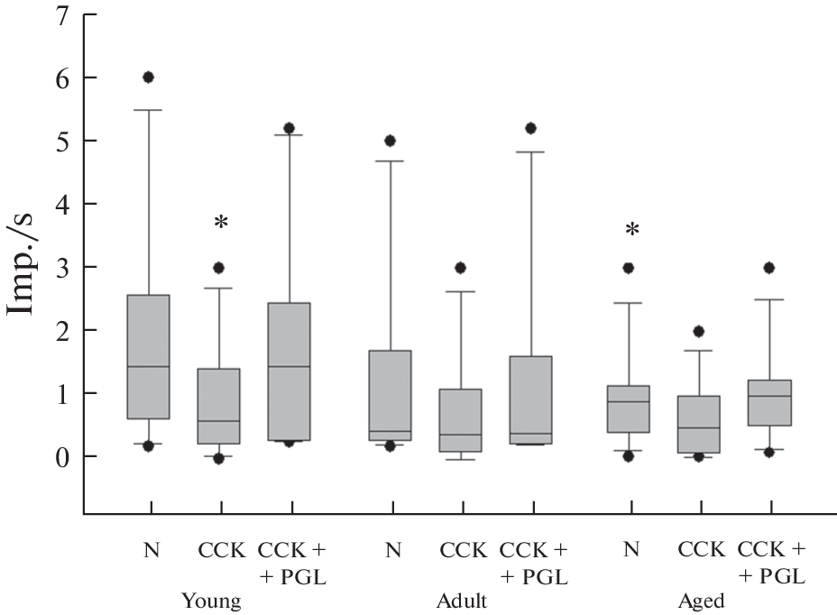 Целью работы являлcя анализ фоновой и вызванной внутривенным введением сульфатированного октапептида холецистокинина (CCK), а также антагониста холецистокинина проглумида импульсной нейронной электрической активности в дорсомедиальном (ДМЯ) и вентромедиальном (ВМЯ) ядрах гипоталамуса у самцов молодых (2–3 мес.), взрослых (12 мес.) и старых (24 мес.) крыс под уретановым наркозом. Средняя частота фоновой импульсации нейронов при внутривенном введении CCK у молодых крыс в ДМЯ достоверно снижалась с 1.5 ± 0.4 до 0.2 ± 0.1 имп./с, в ВМЯ – с 2.0 ± 0.4 до 0.9 ± 0.2 имп./с. Одновременное введение CCK и проглумида не приводило к изменению характера нейронной активности в данной возрастной группе. У взрослых и старых крыс средняя фоновая частота разрядов нейронов ДМЯ и ВМЯ была ниже в сравнении с молодыми крысами и под влиянием CCK и проглумида достоверно не менялась. В ДМЯ и ВМЯ большая часть нейронов ингибировалась CCK, при этом в ДМЯ процент ингибируемых CCK нейронов был выше по сравнению с ВМЯ. В ДМЯ молодых животных отсутствовали нейроны, активируемые CCK, которые появлялись у взрослых и старых животных.