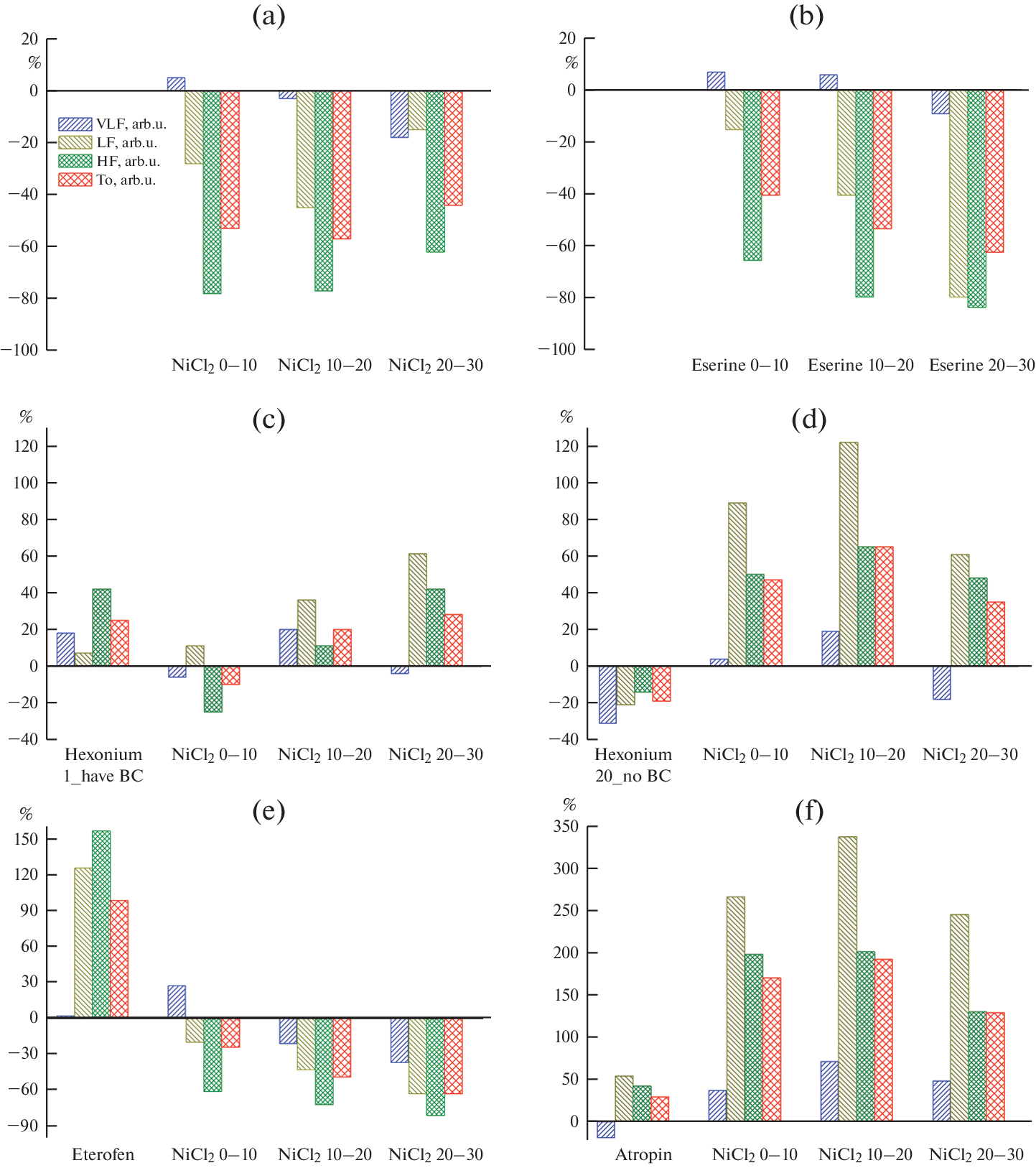A comparative analysis of heart rate variability (HRV) indices after injection of the acetylcholinesterase inhibitor (AChE) physostigmine (¾ LD50) and the T-type calcium channel blocker (T-VDCC) Ni2+ (ED100) into animals was performed in experiments on 3-day-old newborn rats. Both drugs cause phenomenologically similar pathological heart rhythm with significant bradycardia complexes (PHRBC). Analysis of HRV indices showed that the disturbance of heart rhythm regulation mechanisms in NiCl2 poisoning of rats and in cholinoreactive structure activation caused by AChE inhibition develop according to a similar pattern. In both cases there is a decrease in the total power of the spectrum and the absolute power values of the LF (predominantly sympathetic) and HF (parasympathetic influences) bands. Significant decrease in the level of nerve influences leads to the fact that the dominant role in the regulation of heart rhythm begins to play neurohumoral factors (VLF-band). It was found that under conditions of premedication with H- or M-cholinolytics, when rats do not develop cardiac rhythm disturbances, the initial decrease in the severity of neurohumoral and subsequent increase in sympathetic and, to a lesser extent, parasympathetic influences is common. In this case, vagosympathetic balance is not decisive. In case the influence of neurohumoral factors increases after premedication, then later there is a decrease in the proportion of nerve influences and the occurrence of PHRBC. The obtained data suggest that in newborn rats both direct blockade of T-VDCC and changes in ICaT current mediated through M3-subtype muscarinic cholinoreceptors lead to disruption of pacing and development of PHRBC.