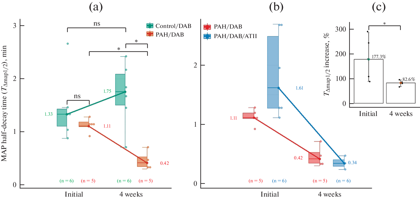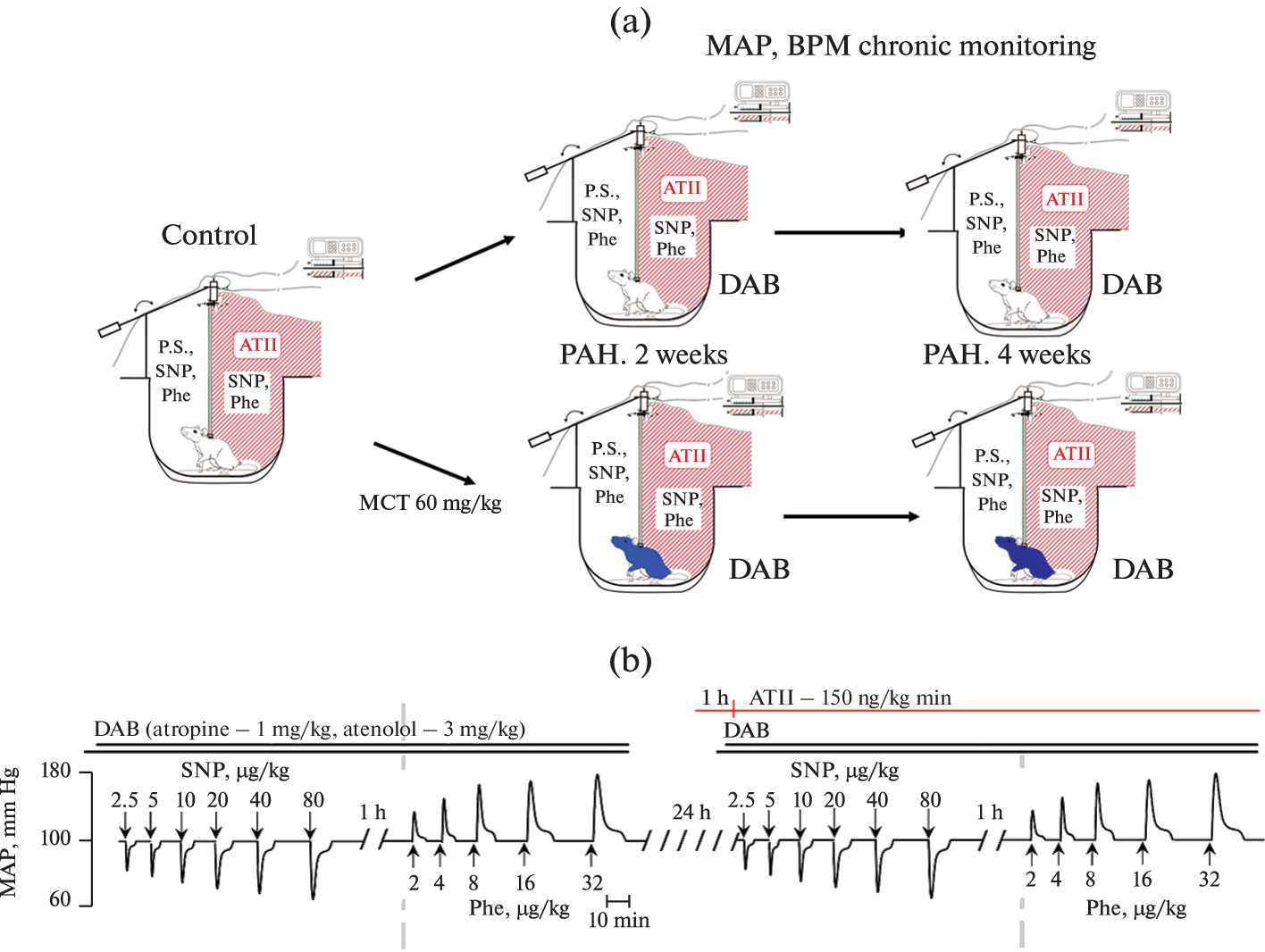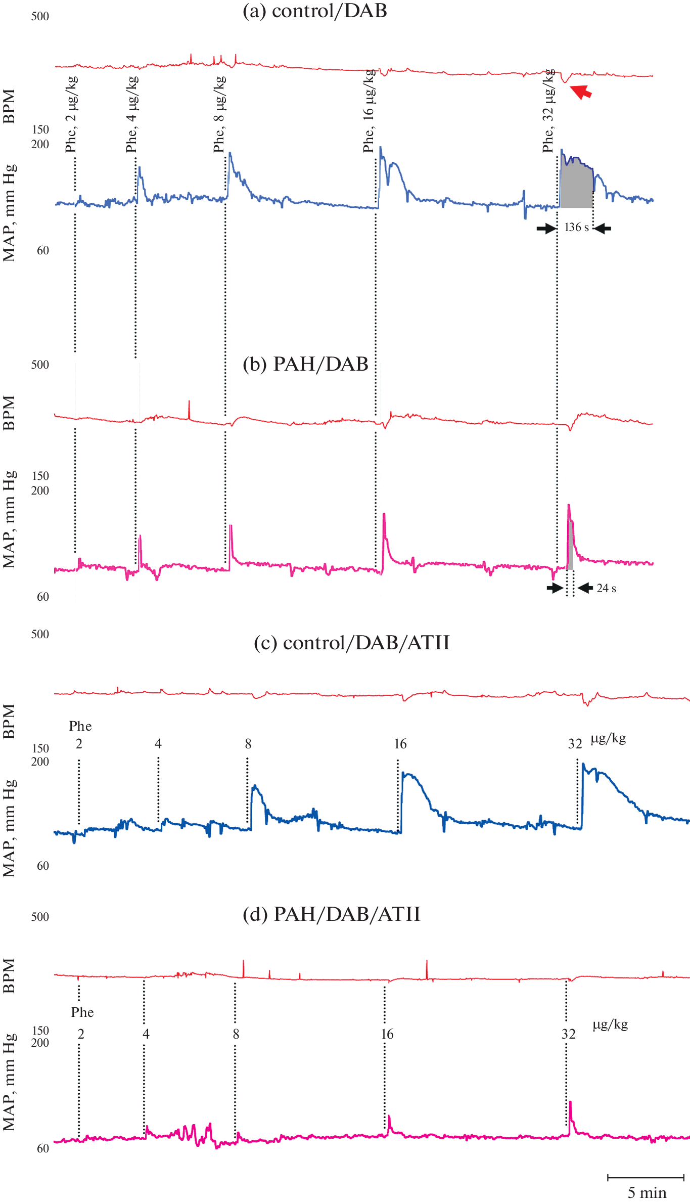 Легочная артериальная гипертензия (ЛАГ) сопровождается подъемом давления в малом круге кровообращения, изменением его чувствительности к регуляторным факторам; для ЛАГ характерна активация симпатического отдела нервной и ренин-ангиотензин-альдостероновой систем. Изменение чувствительности сосудов системного круга кровообращения (СКК) к проконстрикторным воздействиям при ЛАГ не исследовано. В работе изучали вазоконстрикторные реакции в СКК при хронической монокроталиновой модели ЛАГ у крыс. Регистрировали среднее артериальное давление (САД) на фоне двойной автономной блокады при введении агониста α1-адренорецепторов (α1-АР) фенилэфрина (ФЭ) у бодрствующих крыс исходно и через 4 нед. после введения монокроталина (МКТ). Регистрацию САД при действии ФЭ проводили также на фоне ангиотензина-II (АТII). Оценивали максимальную величину (Аmах) изменения САД и наибольшее время полувозвращения САД (T∆САД1/2) к исходному уровню у крыс после введения ФЭ. У крыс ЛАГ через 4 нед. (n = 6) после введения МКТ не наблюдалось значимого изменения Аmах, однако T∆САД1/2 оказывалось значимо меньше, чем у контрольных животных. АТII приводит к увеличению Аmах и T∆САД1/2 у контрольных крыс. Однако у крыс с ЛАГ потенциация антиотензином Аmах и T∆САД1/2 не обнаруживается. Таким образом, у животных с ЛАГ снижается способность артерий большого круга поддерживать тонус в ответ на активацию α1-АР. ЛАГ подавляет способность АТII стимулировать симпатические ответы в СКК. Впервые in vivo на системном уровне продемонстрировано, что ремоделирование и изменение функционального состояния малого круга кровообращения приводит к перестройке регуляции сосудистого тонуса в большом круге кровообращения.