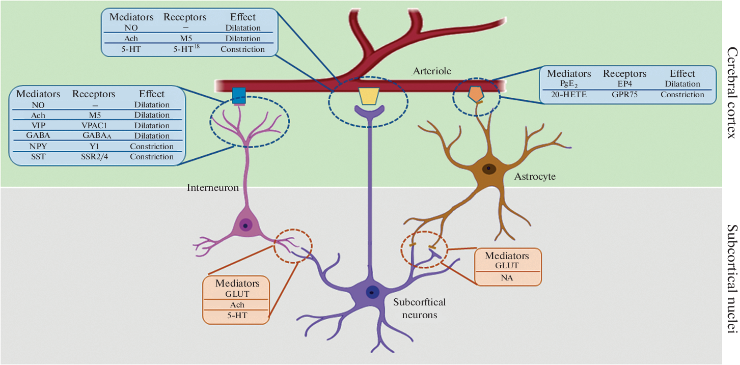 Головной мозг имеет хорошо развитую сосудистую сеть, что позволяет ему потреблять до 15% сердечного выброса при незначительной массе относительно массы всего тела. В норме метаболические потребности головного мозга значительно зависят от интенсивности функционирования различных его отделов, что требует постоянной регуляции уровня местного кровотока. С другой стороны, состояние системной гемодинамики может оказывать значительное влияние на органный кровоток. Сложные и многоуровневые механизмы регуляции органного мозгового кровотока направлены на минимизацию возможных неблагоприятных последствий влияния нарушений системной гемодинамики. К основным механизмам регуляции мозгового кровотока относят: миогенную регуляцию, влияние местных гуморальных воздействий и вазоактивных веществ (гормонов, метаболитов) системного кровотока, изменение газового состава крови (повышение или снижение в крови напряжения кислорода или углекислого газа). Кроме того, выделяют эндотелий-зависимые механизмы регуляции. Наконец, еще один уровень регуляции тонуса мозговых артерий представлен воздействием нейротрансмиттеров, высвобождающихся из терминалей вазомоторных волокон симпатического и парасимпатического отделов вегетативной нервной системы, а также из окончаний субкортикальных нейронов и кортикальных интернейронов. В настоящем обзоре рассмотрены принципы нейрогенной регуляции мозгового кровотока. Нейрогенная регуляция сосудистого тонуса представляет собой наиболее сложный контур регуляции. Вегетативная иннервация мозговых сосудов имеет существенные особенности, отличающие ее от таковой в большинстве других органов большого круга кровообращения. Кроме собственно вегетативной иннервации, сосуды головного мозга получают сенсорную иннервацию, а мелкие внутримозговые артериолы также иннервируются непосредственно нейронами подкорковых ядер и кортикальными интернейронами. В этой связи более глубокое понимание молекулярных механизмов нейрогенной регуляции мозгового кровотока в перспективе может послужить основой для разработки новых методов лечения тяжелых заболеваний головного мозга, основанных на нейромодуляции.