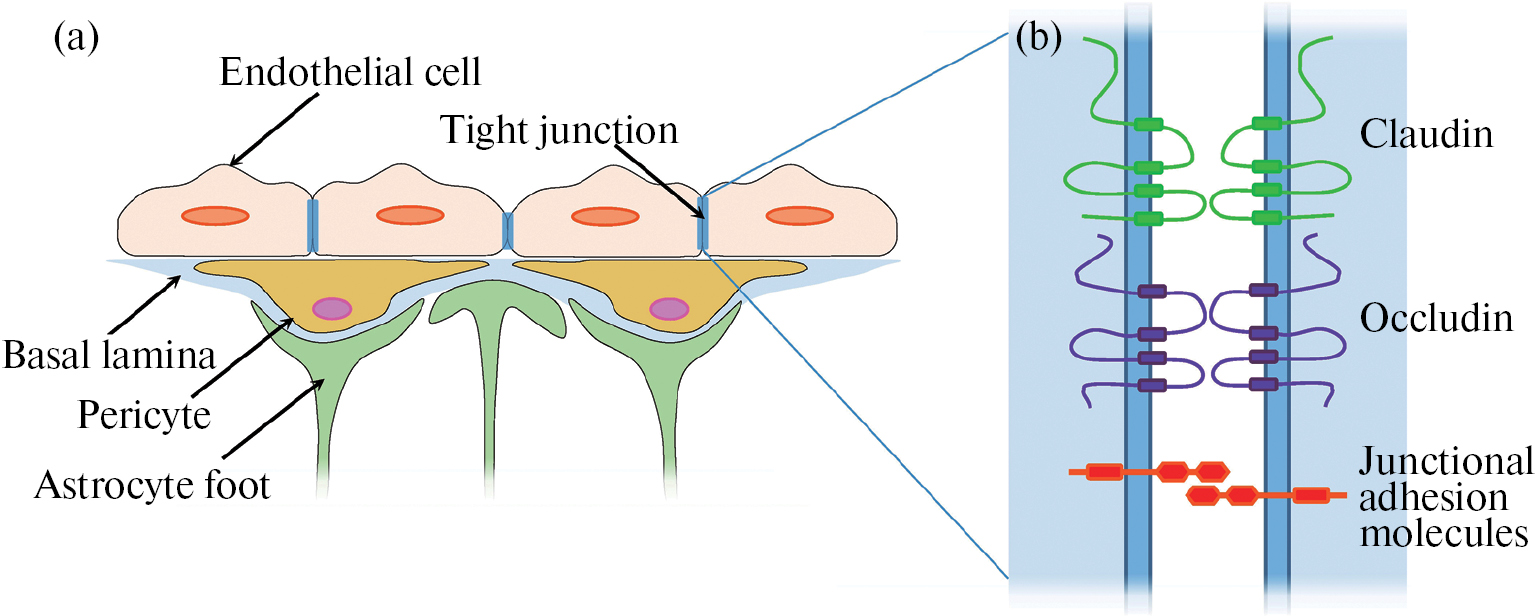 Рис. 1. Гематоэнцефалический барьер и плотный контакт. (a) – Схематичный рисунок гематоэнцефалического барьера в продольном сечении, показывающий эндотелий, базальную мембрану, перициты, астроциты и плотные контакты. (b) – Схематичное изображение плотного контакта, показаны основные структурные белки: клаудин (зеленый), окклюдин (фиолетовый) и молекулы соединительной адгезии (красный).