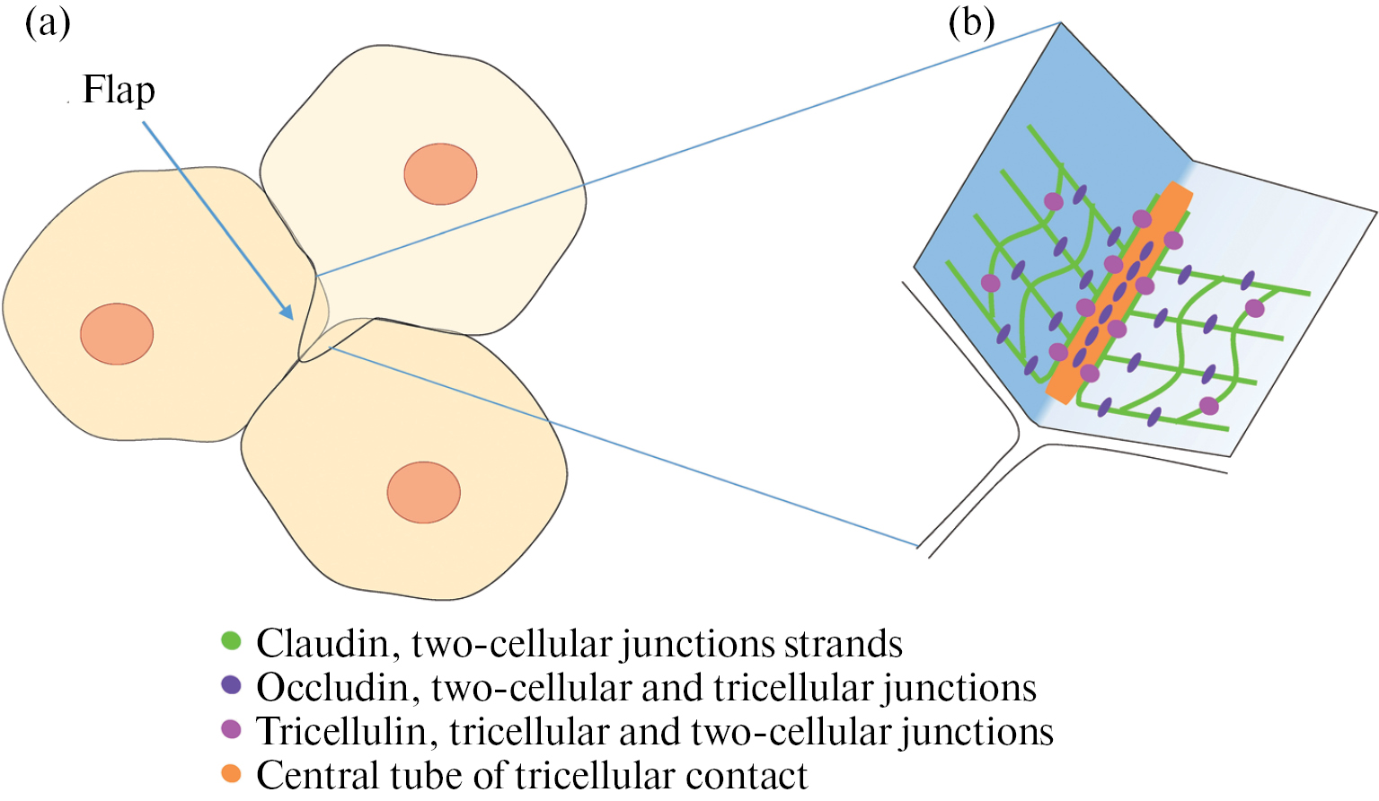 Сеть двухклеточных плотных контактов, состоящая из трансмембранных белков окклюдина и клаудина, расширяется базолатерально при сближении в трехклеточных контактах. Одна из трех клеток настилается тонким лепестком над двумя оставшимися подлежащими клетками, образуя расположенную параллельно локальной плоскости стенки сосуда трехцепочечную структуру с “центральной трубкой” длиной 10 нм [25], которая является местом повышенной парацеллюлярной проницаемости [26]. Основным структурным белком трехклеточного контакта является трицеллюлин, который также встречается и в двухклеточных контактах, но в существенно меньшем количестве [27]. В трехклеточном контакте также повышено количество окклюдина, который образует менее прочные трансмембранные связи и более, чем клаудин, уязвим к ферментативному расщеплению.