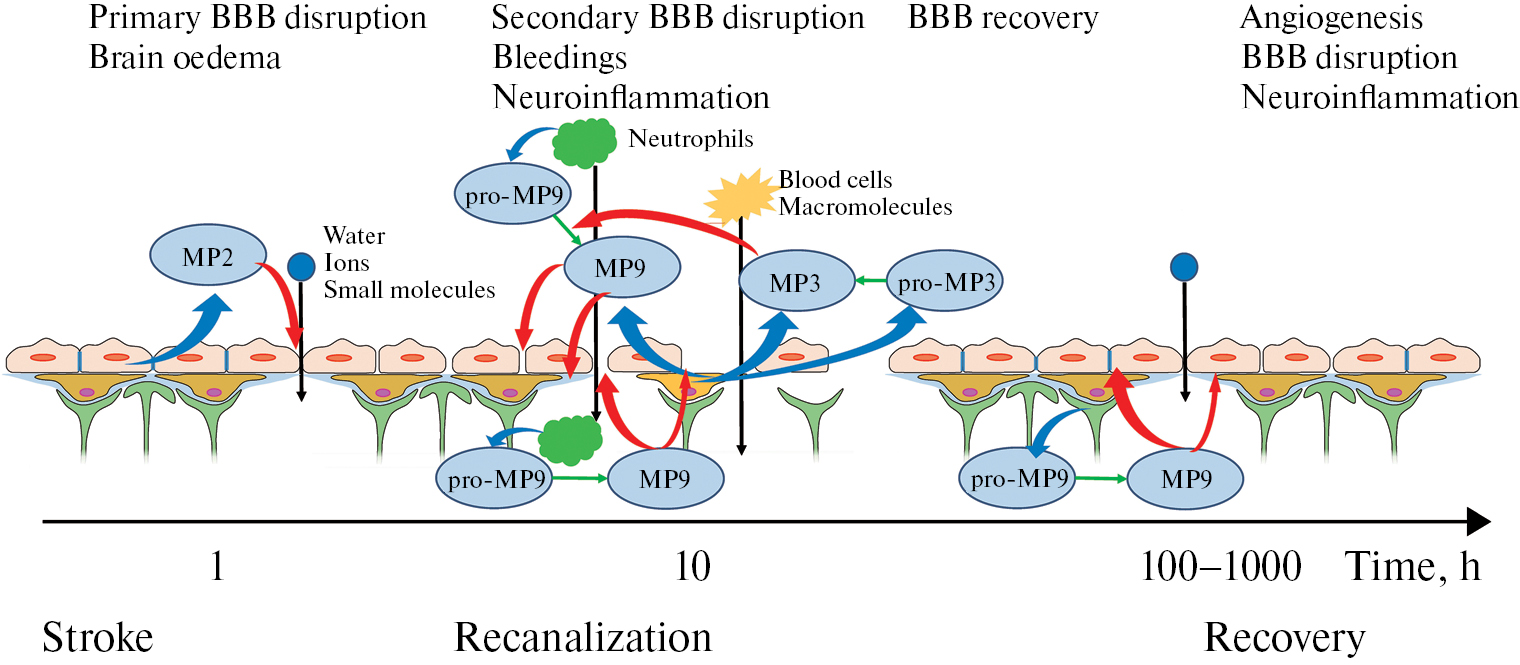 Рис. 3. Схема последовательности основных процессов, происходящих при ишемическом инсульте. Ишемический инсульт вызывает синтез МП2 эндотелиальными клетками; МП2 разрушает плотные контакты, приводя к повышению проницаемости ГЭБ для воды, ионов и малых молекул. Реканализация приводит к появлению в пораженной области нейтрофилов, способных проникать под эндотелий; нейтрофилы дегранулируют про-МП9, которая после активации разрушает базальную мембрану, а также плотные контакты. Перициты секретируют МП3 и про-МП3, которая после активации становится основным активатором МП9. Происходит значительное разрушение ГЭБ, в образующиеся прорехи могут проникать макромолекулы и клетки крови. Восстановление целостности ГЭБ протекает на фоне процессов репарации головного мозга, сопровождающихся ангиогенезом и ремодулированием матрикса, во время которого перициты производят про-МП9, после активации способную приводить к нарушениям целостности ГЭБ.
