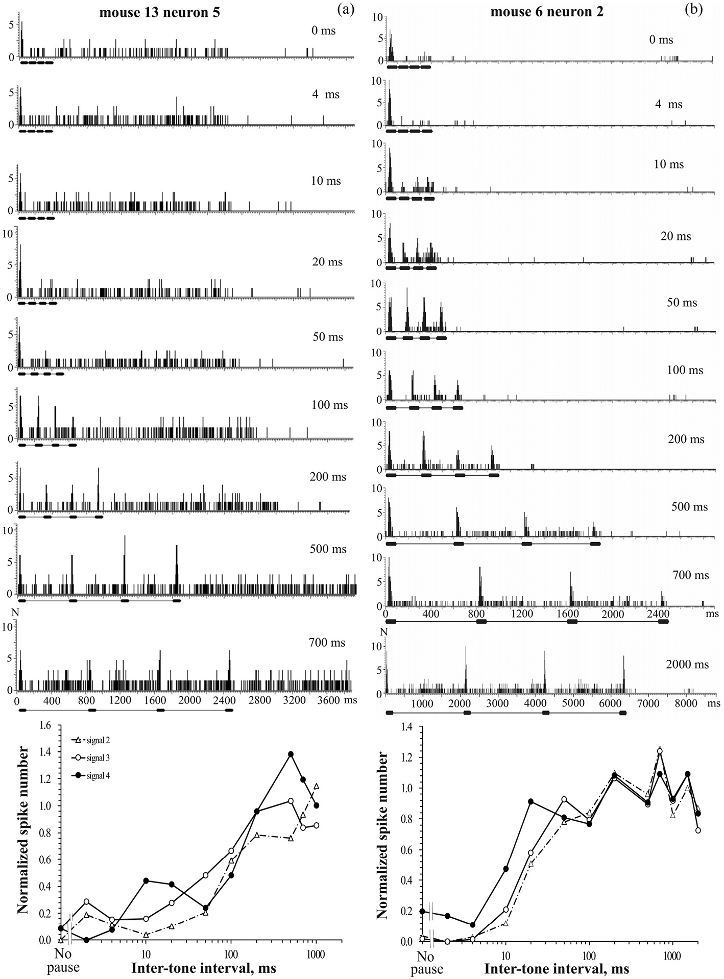 Рис. 1. Примеры активности двух нейронов слуховой коры бодрствующей мыши с различной временной динамикой адаптации (a, b). В верхней части рисунка – перистимульные гистограммы ответов нейронов, вызванных сериями тонов с различными межстимульными интервалами. Значение межстимульного интервала для каждой серии указано цифрами на диаграмме. Число повторения сигналов – 20. Величина бина – 2 мс. Абсцисса – время, мс. Ордината – число спайков, N. Под каждой гистограммой приведена отметка стимула, представляющего собой серию из 4 тонов длительностью 100 мс каждый. В нижней части рисунка – зависимость величины ответа этих же нейронов на 2-й, 3-й и 4-й сигналы серии от межимпульсного интервала (кривые восстановления ответов). Величина ответа нейрона на 2–4-й сигнал серии (число спайков) нормирована относительно его ответа на 1-й сигнал, т. е. равна отношению числа спайков в ответе нейрона на соответствующий сигнал к числу спайков в ответе на 1-й сигнал.