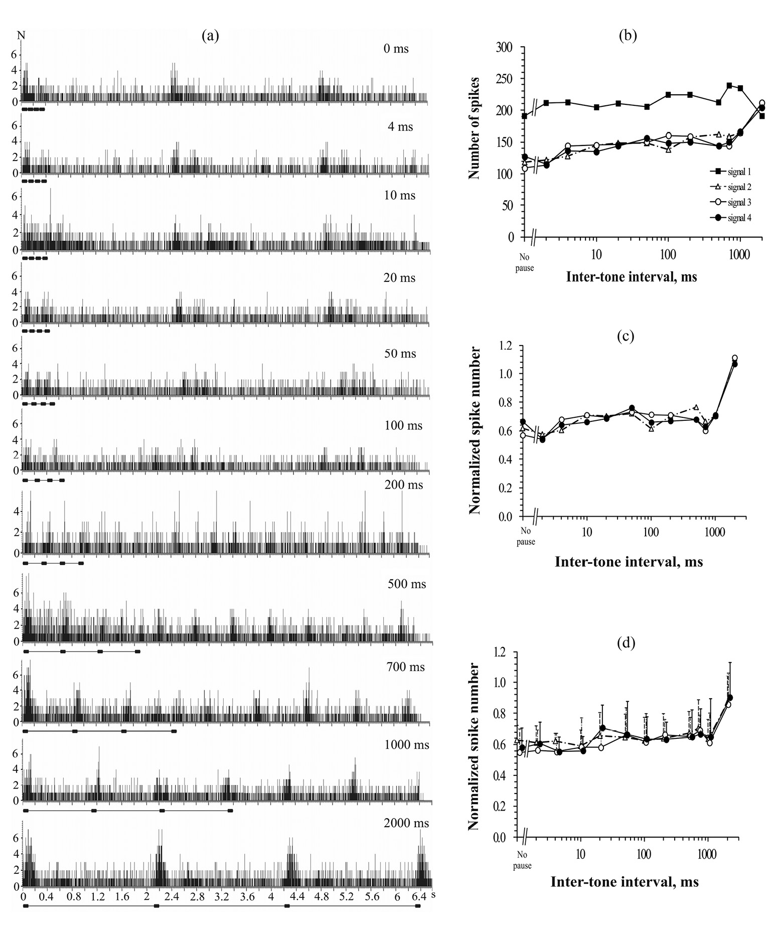 Рис. 3. Временная динамика адаптации к сериям сигналов околопороговых уровней. (а) – Перистимульные гистограммы ответов одиночного нейрона, вызванных сериями тонов с различными межстимульными интервалами. Значение межстимульного интервала для каждой серии указано цифрами на диаграмме. Число повторения сигналов – 20. Величина бина – 2 мс. Временное окно анализа данных – 6.4 с. Абсцисса – время, c. Ордината – число спайков, N. Под каждой гистограммой приведена отметка стимула, представляющего собой серию из 4 тонов длительностью 100 мс каждый. (b) – Зависимость числа спайков в ответе одиночного нейрона на 1-й, 2-й, 3-й и 4-й сигналы серии от межстимульного интервала. Абсцисса – время, мс. Ордината – число спайков, N. (c) – Нормированные функции восстановления ответов одиночного нейрона на 2-й, 3-й и 4-й сигналы серии; (d) – Нормированные функции восстановления ответов на 2-й, 3-й и 4-й сигналы серии, усредненные по 8 нейронам. Указаны стандартные отклонения средних величин ответов нейронов на соответствующие тоны серии. Остальные обозначения – как на рис. 1.