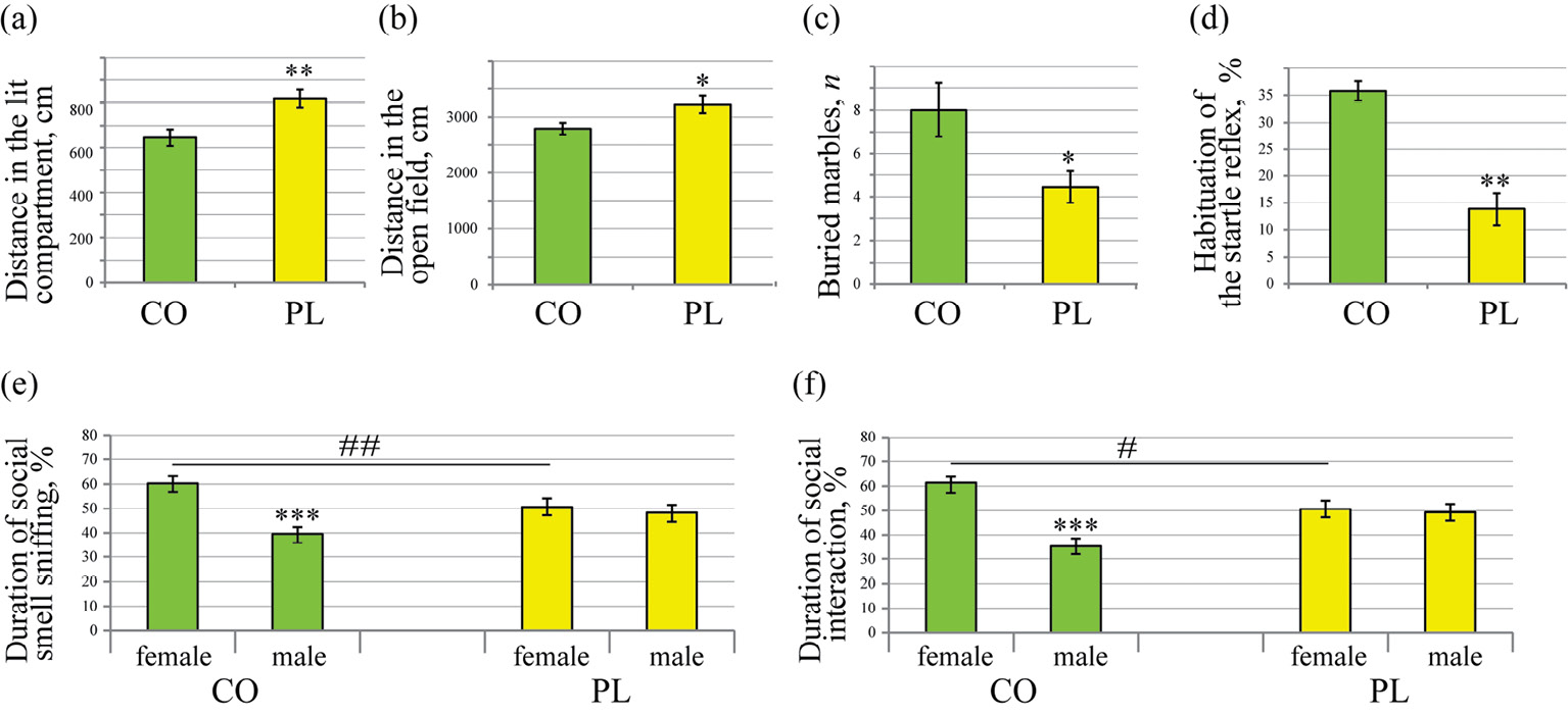Рис. 1. Поведенческие характеристики животных, длительно принимавших смесь ФЛ (фосфатидилсерина, фосфатиднокислоты и фосфатидилхолина). (a) – Увеличение пути в светлом отсеке в тесте Темно-светлая камера; (b) – увеличение общего пройденного пути в открытом поле в тесте Открытое поле; (c) – снижение числа закопанных шариков в тесте закапывания шариков; (d) – снижение габитуации в тесте акустической стартл-реакции; (e) – нарушение предпочтения в тесте на предпочтение социальных запахов; (f) – нарушения социального и полового предпочтения в тесте с двумя интрудерами. CO – контрольные животные C57BL/6J, PL – животные, длительно принимавшие смесь ФЛ. Данные представлены как среднее значение ± стандартная ошибка среднего, n = 10 для каждой группы, * – p < 0.05, ** – p < 0.01, ***– p < 0.001.