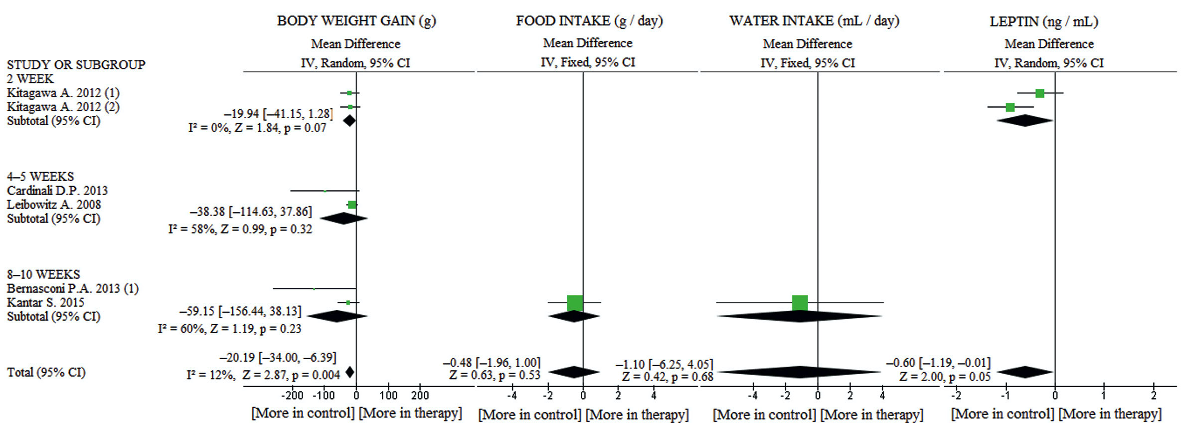 5. Fig. 4. The effect of melatonin therapy on body weight gain, feed and water intake, and leptin levels in rats on a high-fructose diet. The meta-analysis was done without additional standardization of the dose, method and time of administration of melatonin.