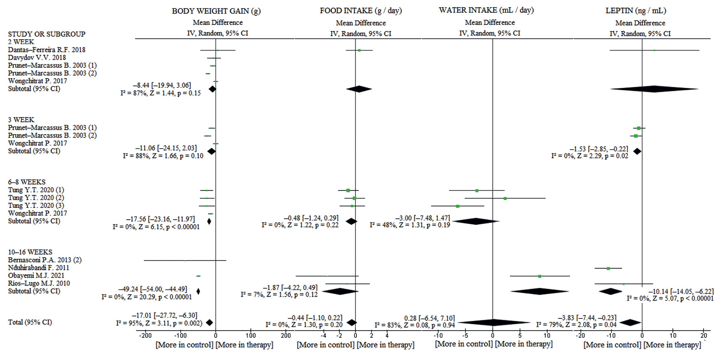 6. Fig. 5. The effect of melatonin therapy on body weight gain, feed and water intake, and leptin levels in rats on a high-fat diet. The meta-analysis was done without additional standardization of the dose, method and time of administration of melatonin.