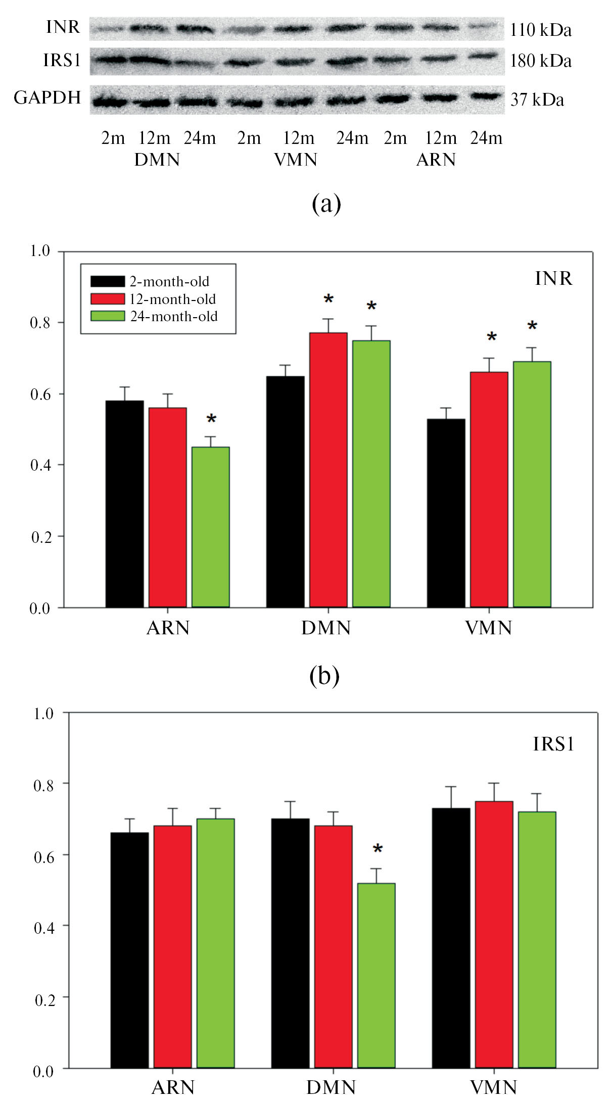 Рис. 3. Вестерн-блоты IRN и IRS1 (a), количественный анализ уровня экспрессии белков IRN (b), IRS1 (c) в дорсомедиальном (DMN), вентромедиальном (VMN) и аркуатном (ARN) ядрах гипоталамуса у 2- (2m), 12- (12m) и 24-месячных (24m) крыс. Данные представлены в процентах от уровня экспрессии GAPDH. * p < 0.05; различия достоверны по сравнению с 2-месячными крысами.