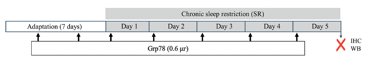Рис. 1. Схема эксперимента. Adaptation (7 days) – адаптация животных в течение 7 дней. Chronic sleep restriction (SR) – хроническое ограничение сна. Day 1–5 – 1–5 сутки ограничения сна. IHС – immunohistochemistry, взятие биоматериала головного мозга для иммуногистохимического анализа. WB – western-blot, взятие биоматериала головного мозга для вестерн-блоттинг анализа.