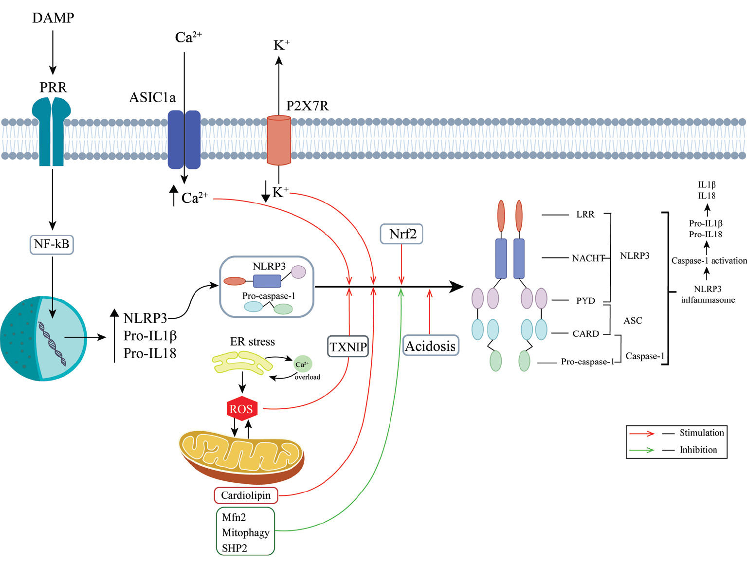 Рис. 1. Структура NLRP3 инфламмасомы и гипотетические факторы активации. Обозначения: ASC – связанный с апоптозом пятнышкообразный белок, содержащий домен активации и рекрутирования каспазы; ASIC1a – кислото-чувствительный ионный канал; CARD – домен активации и рекрутирования каспазы; DAMP – молекулярные паттерны, связанные с повреждением; IL18 – интерлейкин 18; IL1β – интерлейкин 1β; LRR – домен, содержащий обогащенные лейцином повторы; Mfn2 – митофузин 2; NACHT – центральный домен связывания нуклеотидов и олигомеризации; NF-kB – ядерный фактор-κB, NLRP3 – NODподобный рецептор, содержащий пириновый домен 3; Nrf2 – ядерный фактор 2-родственный эритроидному фактору 2; P2X7R – пуринергический лиганд-зависимый ионный канал 7; PRR – рецептор распознавания образов; PYD – пириновый домен; SHP2 – тирозинфосфатаза 2, содержащая домен гомологии Src 2; TXNIP – тиоредоксин-взаимодействующий белок; ROS – активные формы кислорода; ER – эндоплазматический ретикулум.