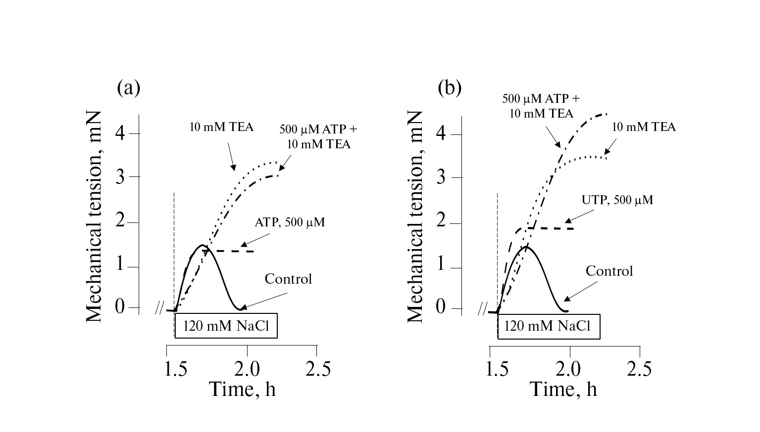 Для получения изоосмотической стрикции сегменты инкубировали в течение 60 мин в гипоосмотическом растворе Кребса, содержащем 40 мМ NaCl, и затем возвращали в нормальный раствор Кребса (120 мМ NaCl). Для активации пуринергических рецепторов использовали неселективный активатор P2X- и P2Y-рецепторов АТФ и селективный активатор P2Y-рецепторов (P2Y2, P2Y4) уридин-5’-трифосфат (УТФ) [23, 24].