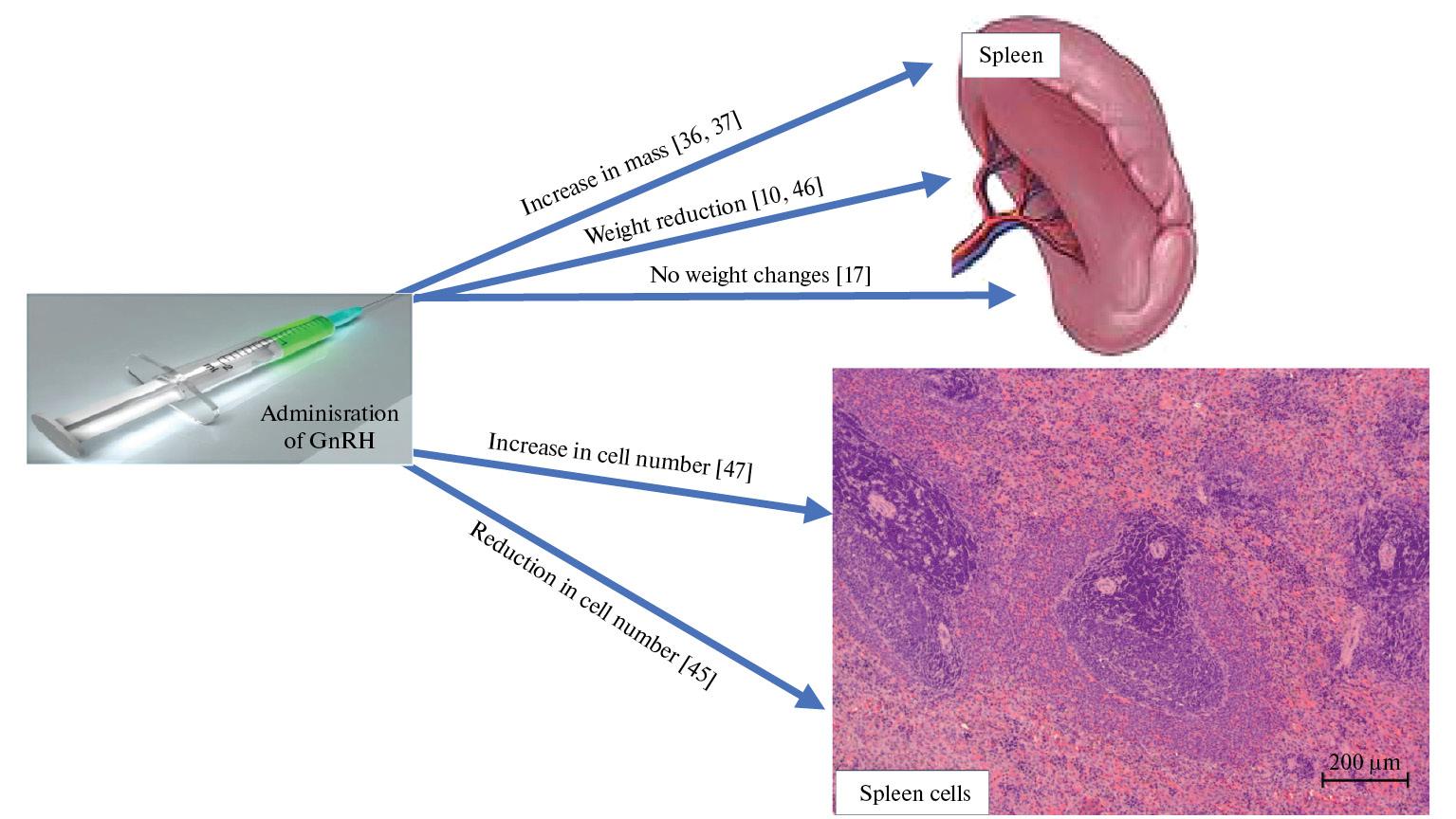 Иммунизация баранов против ГнРГ увеличивала его выработку в селезенке за счет устранения ингибирующих эффектов обратной связи со стороны тестостерона. Параллельно с увеличением продукции ГнРГ в селезенке наблюдали экспрессию мРНК ИЛ-2, ИЛ-4, ИЛ-6 и TNF-α, а также увеличение численности CD4+, CD8+ и CD19+ лимфоцитов (p < 0.05) [47]. Однако согласно результатам исследований Ishikawa [48] и Tokuoka с соавт. [49], даназол и бусерелин не влияли на активность натуральных киллерных клеток селезенки крыс, ингибированную при экспериментальном эндометриозе, а Ataya с соавт. [17] не наблюдали значительного увеличения массы селезенки). Масса селезенки уменьшалась у кастрированных самцов под влиянием агониста гормона и возрастала или снижалась (по разным данным) в результате активной иммунизации против ГнРГ, хотя прямое действие ГнРГ на клетки органа выявлено не было. Также после воздействия ГнРГ зарегистрировано сокращение численности В-клеток в органе и лимфоцитов в периферической крови.