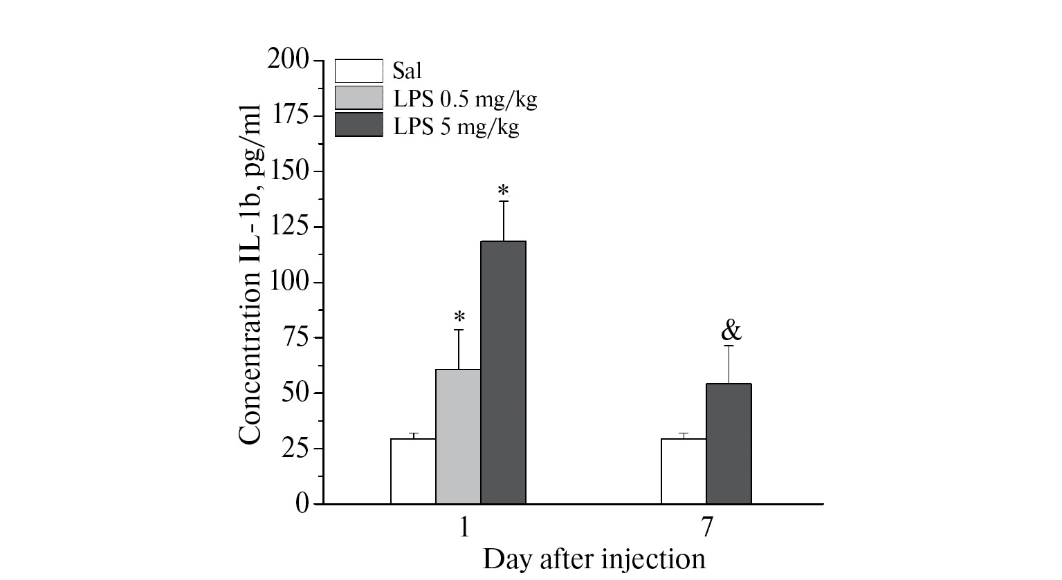 Рис. 3. Изменение уровня ИЛ-1бета в плазме крови крыс через 1 и 7 дней после однократного внутрибрюшинного введения ЛПС. * – p < 0.05 по сравнению с животными через сутки после введения физиологического раствора; & – p < 0.05 по сравнению с животными через сутки после введения ЛПС в дозе 5 мг/кг.