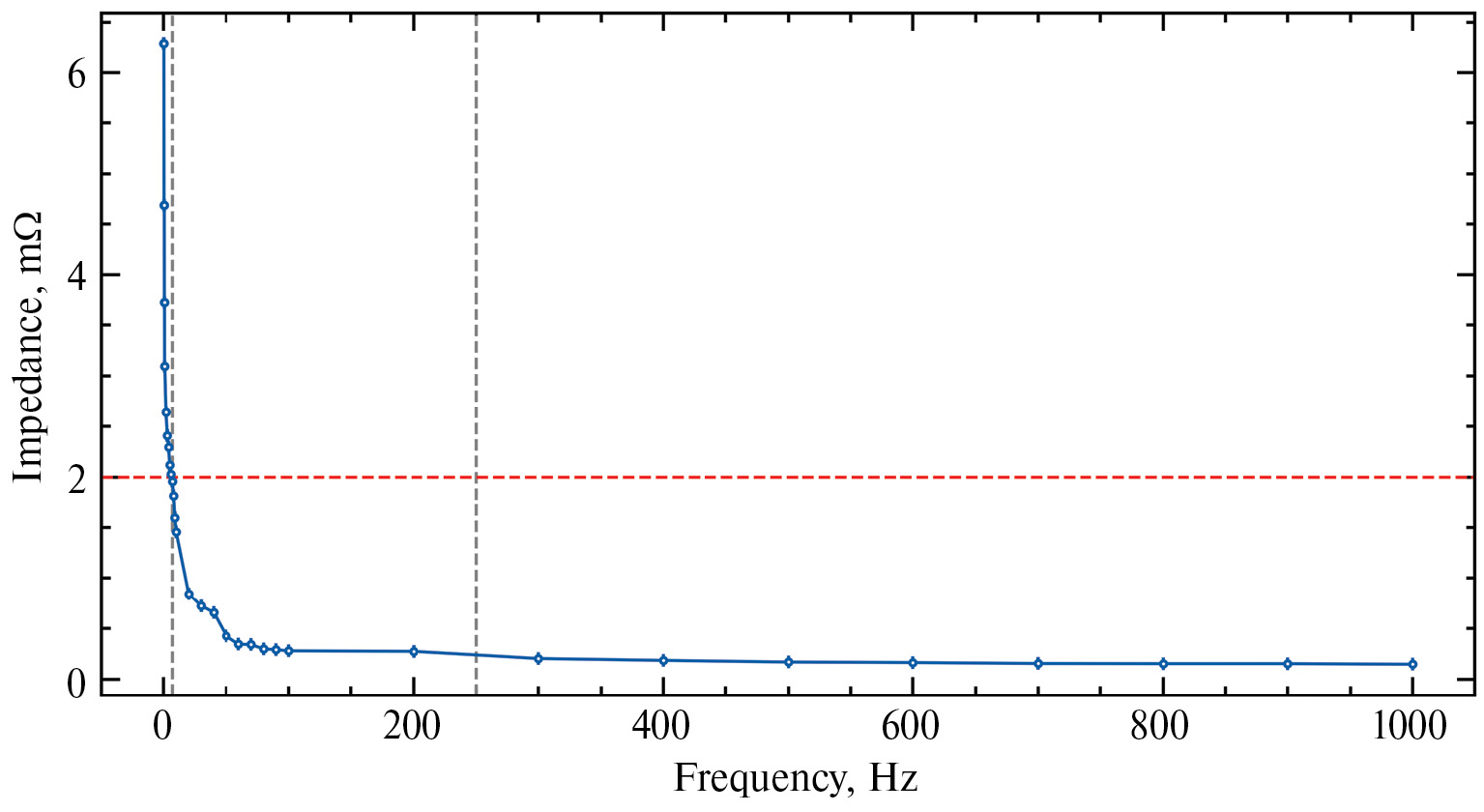Импеданс – это мера сопротивления микроэлектрода переменному току. В нейробиологических исследованиях in vivo на нейронных популяциях импеданс измеряется в диапазонах частот от 0.1 до 1000 Гц. Низкие значения импеданса являются важной характеристикой для записи нейронной активности, так как значения выше 5 MΩ могут вызывать шумы и затухание сигнала [15]. Важно учитывать, что значение импеданса можно снизить за счет увеличения эффективной площади и шероховатости поверхности микроэлектрода при гальваническом покрытии и осаждении проводящими полимерами PEDOT и PEDOT/PSS [16], платиновой чернью [17] и оксидом иридия [18]. Измерение импеданса микроэлектрода происходит с помощью RLC-метра по методу автоматической балансировки электрического моста [19].