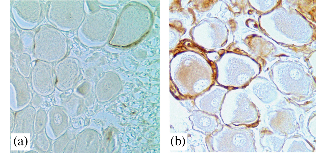 Рис. 2. Увеличение GFAP-иммунопозитивных клеток-сателлитов в DRG при старении. (a) – трехмесячная крыса; (b) – крыса в возрасте 18 месяцев. Иммуногистохимическая реакция на GFAP, ×400. Собственные данные.
