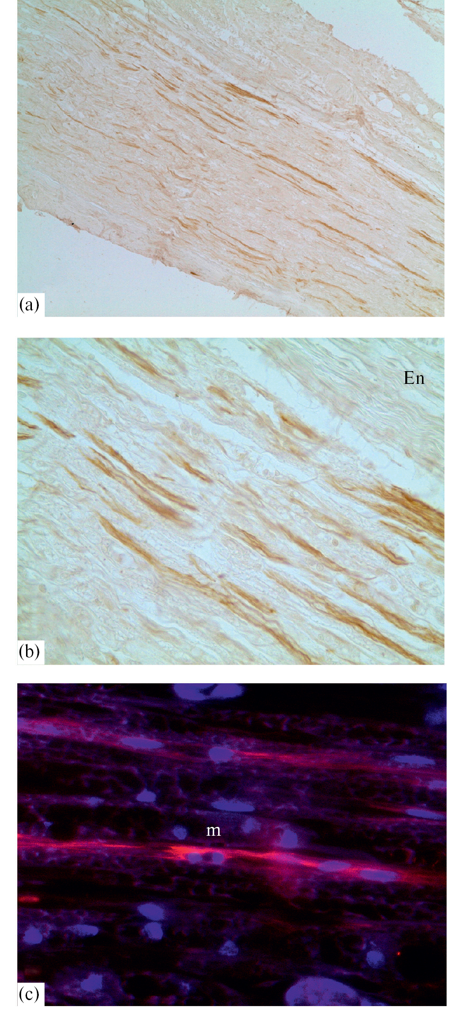 Рис. 3. Шванновские клетки (repair Schwann cells) в дистальном сегменте поврежденного нерва крысы через 7 суток после операции (лигатура, 40 с). (a) – общий вид дистального сегмента нерва, продольный срез, (b) – фрагмент эндоневрия со шванновскими клетками, (c) – митотически делящаяся (m) шванновская клетка. En – эндоневрий седалищного нерва крысы. Иммуногистохимическая реакция на GFAP. Визуализация с помощью флуорохрома TRITC (красный), подкрашивание ядер DAPI (синий), ×100 (a), ×400 (b), ×600 (c) (рисунок из статьи Петровой Е.С., Колос Е.А. [73]).