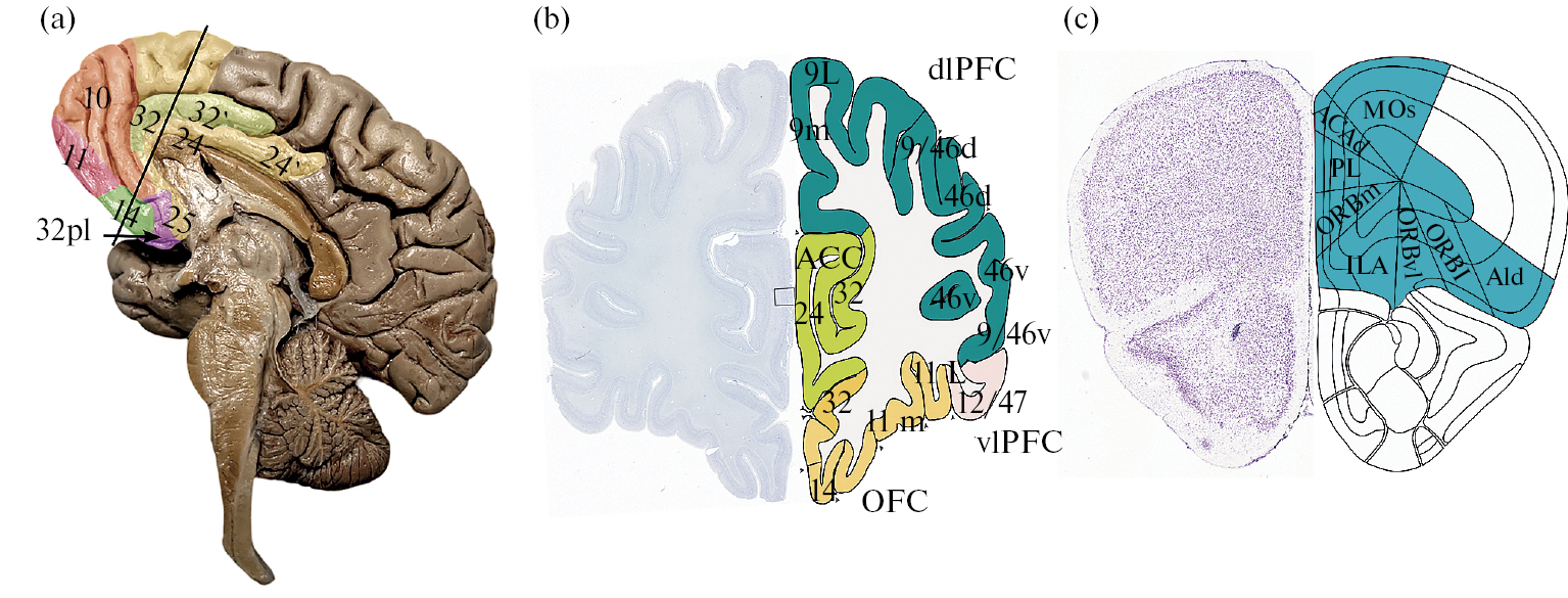Рис. 1. Анатомия префронтальной коры (PFC) приматов и грызунов. (a) – мозг человека, вид с медиальной плоскости, цветом отмечены поля Бродмана, входящие в PFC, линией отмечен примерный уровень среза на рис. 1b (препарат анатомического музея Факультета естественных наук Новосибирского государственного университета); (b) – фронтальный срез мозга человека (Allen Reference Atlas – Human Brain, atlas.brain-map.org [96]) и анатомическая схема названия областей и полей Бродмана, входящих в PFC; (c) – коронарный срез мозга мыши: окраска по Нисслю и подразделение PFC на основные анатомические зоны (Allen Reference Atlas – Mouse Brain, atlas.brain-map.org [97]).
