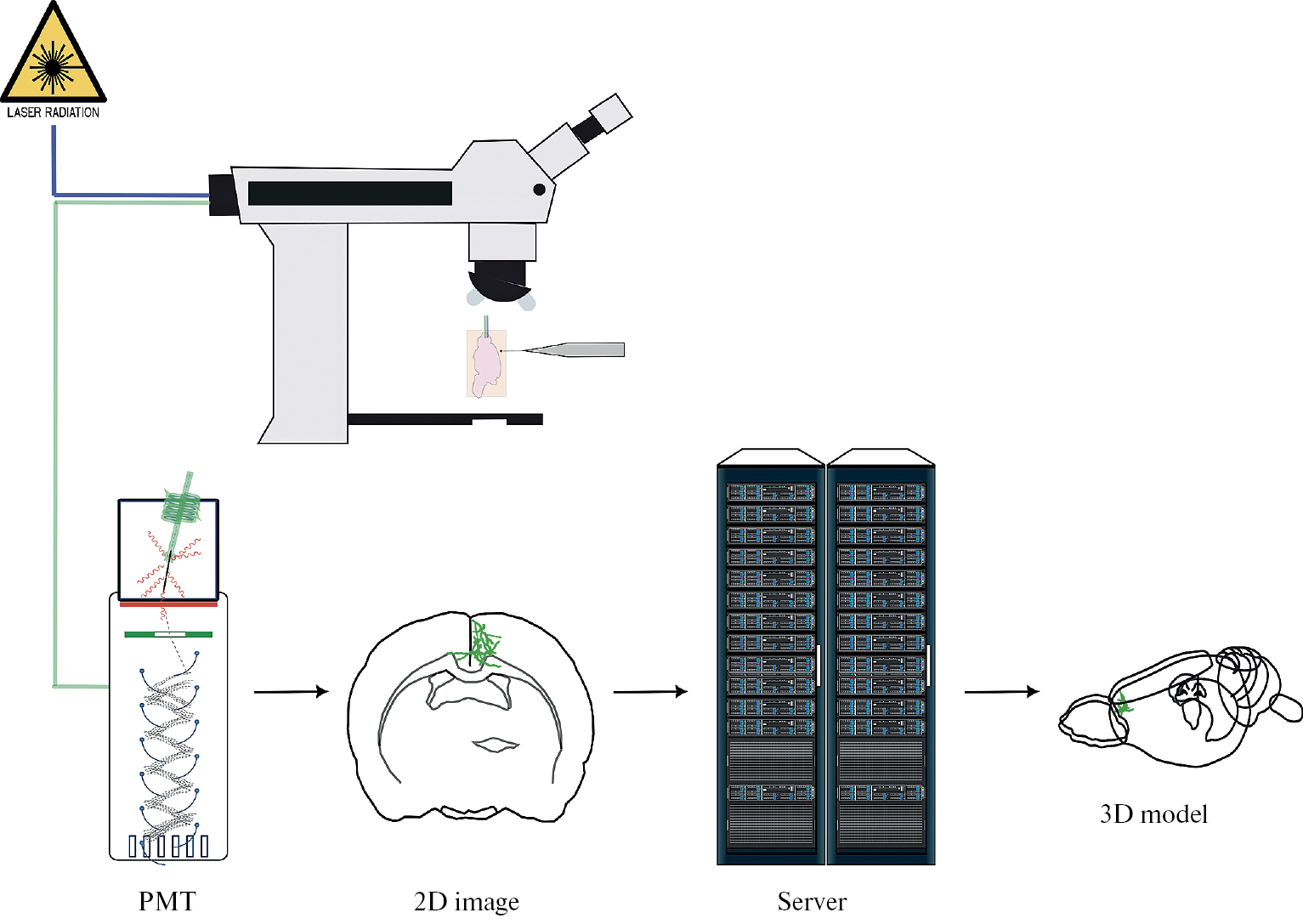 Рис. 2. Схема, отображающая получение трехмерной компьютерной модели ветвления единичных нейронов при помощи флуоресцентной микрооптической секционной томографии (fMOST). PMT – детектирующий фотоумножитель.