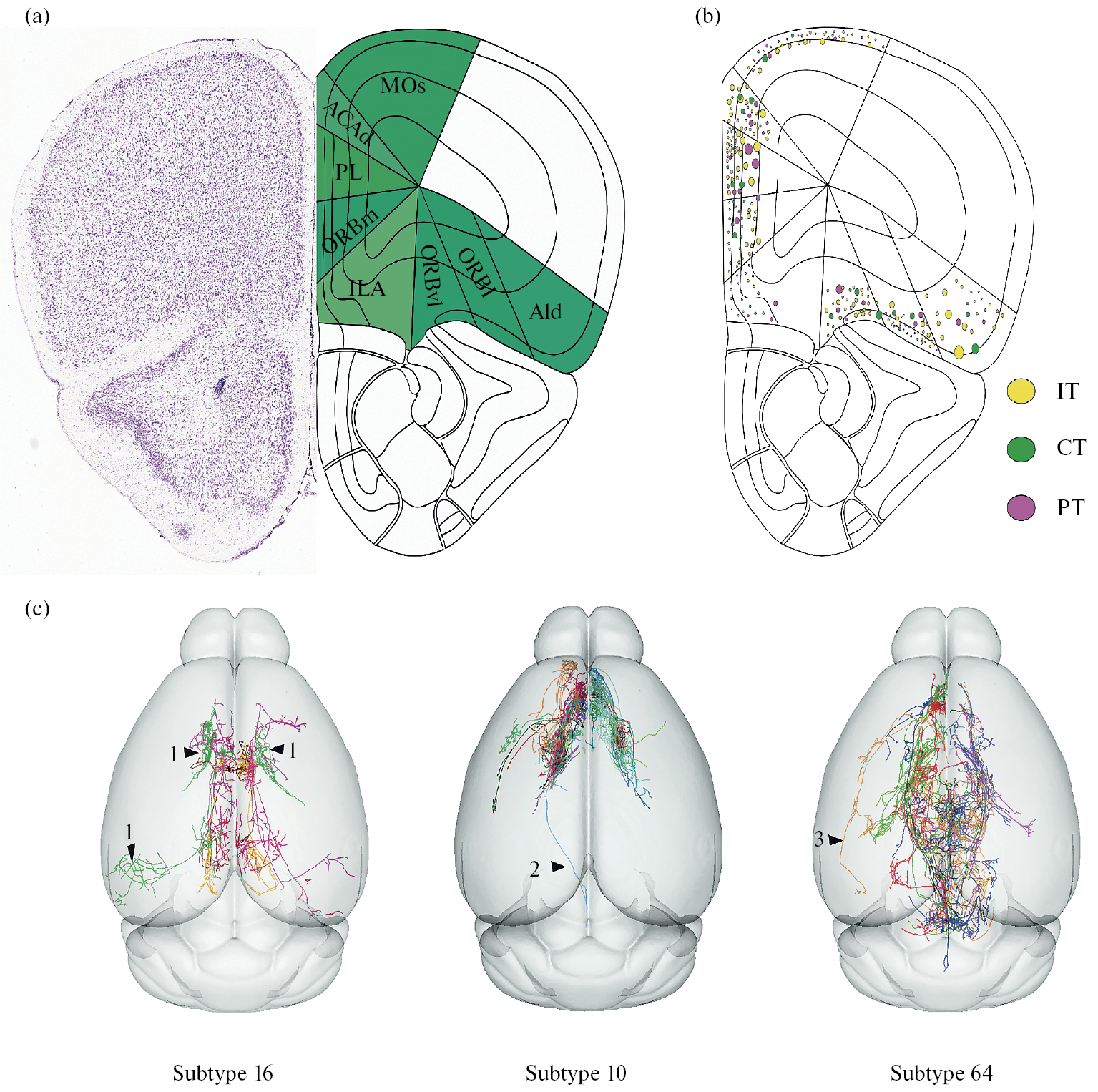 Рис. 3. Проекционные нейроны префронтальной коры. (a) – окраска по Нисслю и подразделение PFC на основные анатомические зоны (Allen Reference Atlas – Mouse Brain, atlas.brain-map.org [97]); (b) – расположение проекционных нейронов PFC по данным Gao с соавт. [16] (https://mouse.braindatacenter.cn/). Размер кругов пропорционально соответствует числу нейронов каждого подтипа в пределах анатомической зоны; (c) – представлены некоторые типы проекционных нейронов. Видны коллатерали IT-нейронов 10-го типа (отмечены стрелками и цифрой 1), субкортикальная коллатераль IT-нейрона 16-го типа (отмечена стрелкой и цифрой 2) и кортикальная коллатераль PT-нейрона 64-го типа (отмечена стрелкой и цифрой 3). Отдельные нейроны обозначены разными цветами [16], (https://mouse.braindatacenter.cn/).