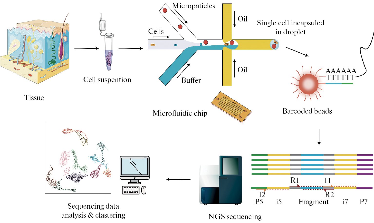 Рис. 4. Схема, отображающая принципы транкриптомики единичных клеток. Ткань разбивают на клетки, после чего в микрофлюидном чипе объединяют с баркодированными бусинами в несмешивающуюся эмульсию. Обратную транскрипцию проводят по механизму переключения матрицы с целью включения заданных последовательностей по концам. После этого проводят массовое параллельное секвенирование NGS, компьютерную обработку и кластеризацию.