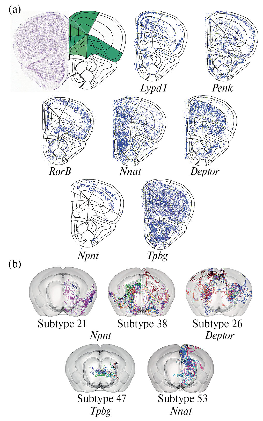 Рис. 5. Экспрессия основных генов маркеров. (a) – экспрессия основных маркерных генов в PFC по данным транскриптомики единичных клеток (данные in situ гибридизации взяты из Allen Mouse Brain Atlas, mouse.brain-map.org [98]); (b) – приведены некоторые типы проекционных нейронов и маркеры, которые экспрессируются преимущественно в них. Отдельные нейроны обозначены разными цветами. По данным Gao с соавт. [16].