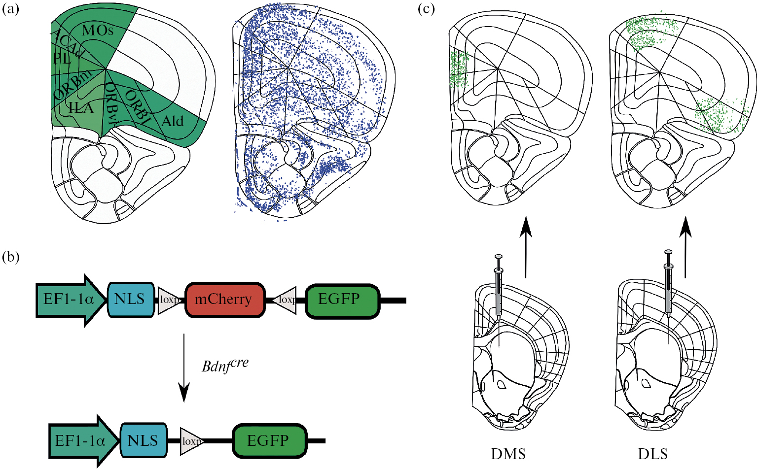 Рис. 6. Проекционные нейроны PFC, экспрессирующие нейротрофический фактор мозга Bdnf. (a) – экспрессия Bdnf в PFC. Приведены данные in situ гибридизации из Allen Mouse Brain Atlas, mouse.brain-map.org [98]. (b) – репортерная конструкция, которая вводилась Ehinger с соавт. Bdnfcre мыши в виде аденоассоциированных вирусов с капсидом, трансдуцирующим нейроны ретроградно (ретроградных трассеров) в разные области стриатума. (c) – экспрессирующие BDNF нейроны PFC, проецирующиеся в разные области стриатума, выявленные при помощи введения ретроградных трассеров в дорсомедиальный (DMS) и дорсолатеральный (DLS) стриатум [54].