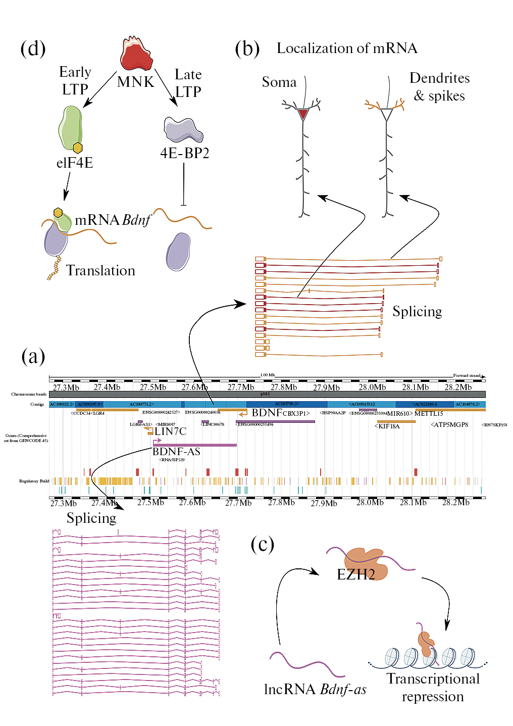 Рис. 7. Регуляция экспрессии Bdnf. (a) – схема локуса человека, в котором располагаются Bdnf и Bdnf-as [64]. (b) – существует большое количество сплайс вариантов мРНК Bdnf [68], которые могут располагаться в различных компартментах нейрона и обеспечивать различный локальный синтез белка. (c) – антисмысловая РНК (lnсРНК) Bdnf-as, связывается с поликомб белком EZH2 и вызывает метилирование гистонов и транскрипционную репрессию [71]. (d) – синтез белка BDNF происходит по-разному, в зависимости от фазы синаптической потенциации (LTP), что контролируется киназой MNK [66].