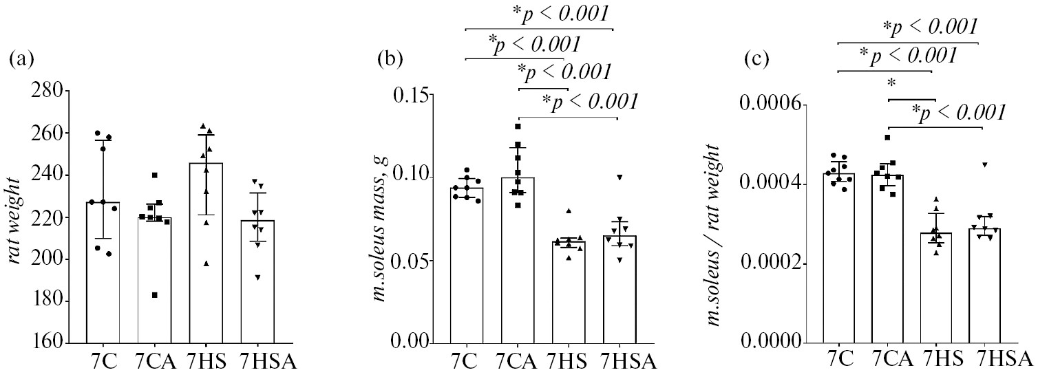 Рис. 1. Масса тела животных (а), масса m. soleus (b) и индекс сырой массы m. soleus (c). 7С – виварный контроль с введением плацебо, 7СA – виварный контроль с введением 2-APB, 7HS – 7-суточное вывешивание с введением плацебо, 7HSA – 7-суточное вывешивание с введением 2-APB. * – значимые отличия между группами (p < 0.001).