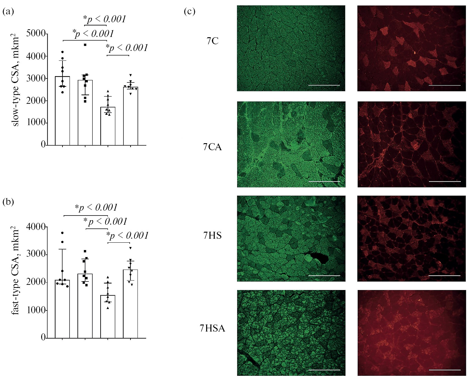 Рис. 2. Площадь поперечного сечения медленных волокон (а), быстрых волокон (b) и микрофотографии иммуногистохимической окраски медленного миозина (зеленые) и быстрого миозина (красные) (c). 7С – виварный контроль с введением плацебо, 7СA – виварный контроль с введением 2-APB, 7HS – 7-суточное вывешивание с введением плацебо, 7HSA – 7-суточное вывешивание с введением 2-APB. * – значимые отличия между группами. Размерная полоса равна 200 мкм.