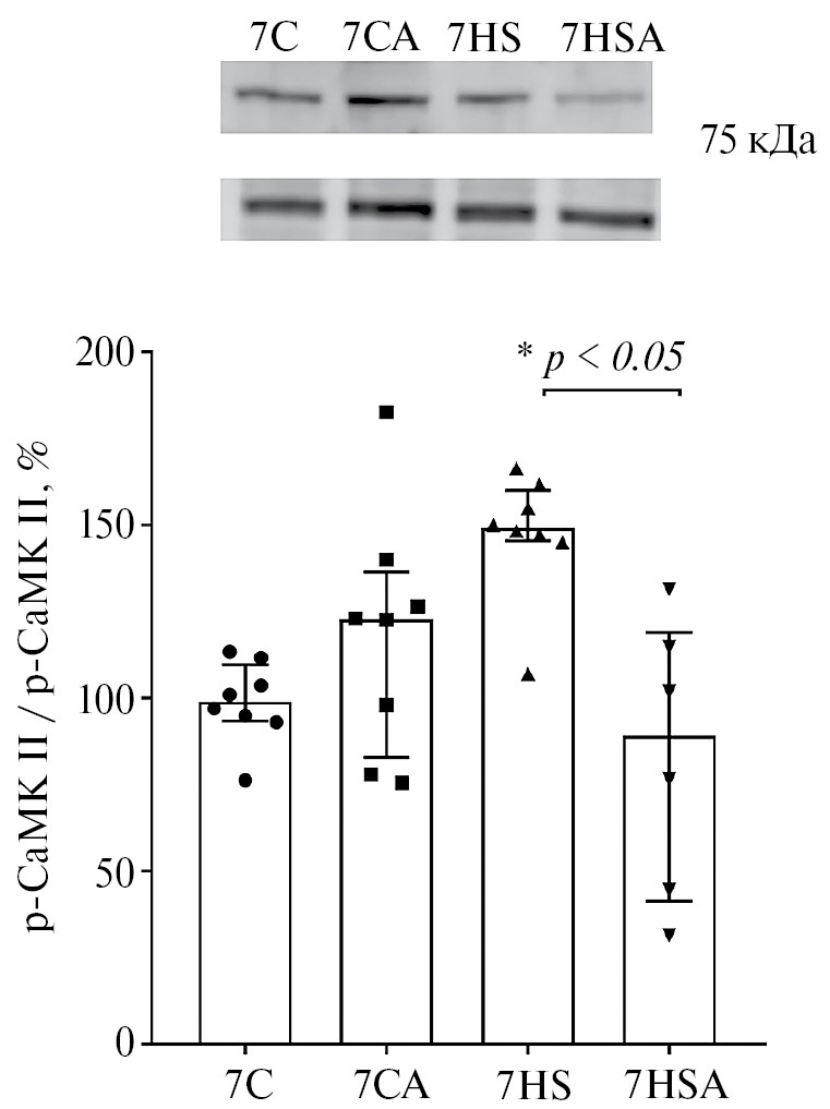 IP3R находятся в мембране саркоплазматического ретикулума, ядра, а также митохондрий, активируются IP3 и Ca2+ [10, 11, 52], а также регулируют гомеостаз кальция в клетке [53]. CaMKII – кальций-зависимая киназа [54]. Наблюдаемое снижение экспрессии IP3R в группе 7HSA, наряду с ингибирующим действием 2-APB на активные центры рецепторов, могло внести вклад в снижение кальций-зависимого фосфорилирования CaMKIIb в данной экспериментальной группе.